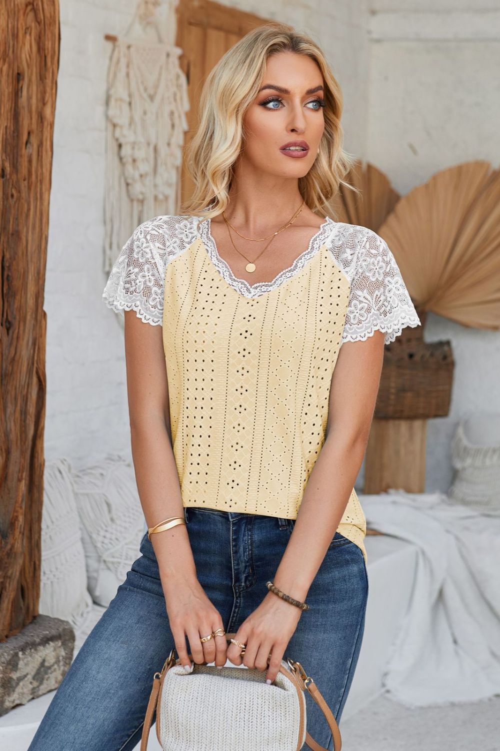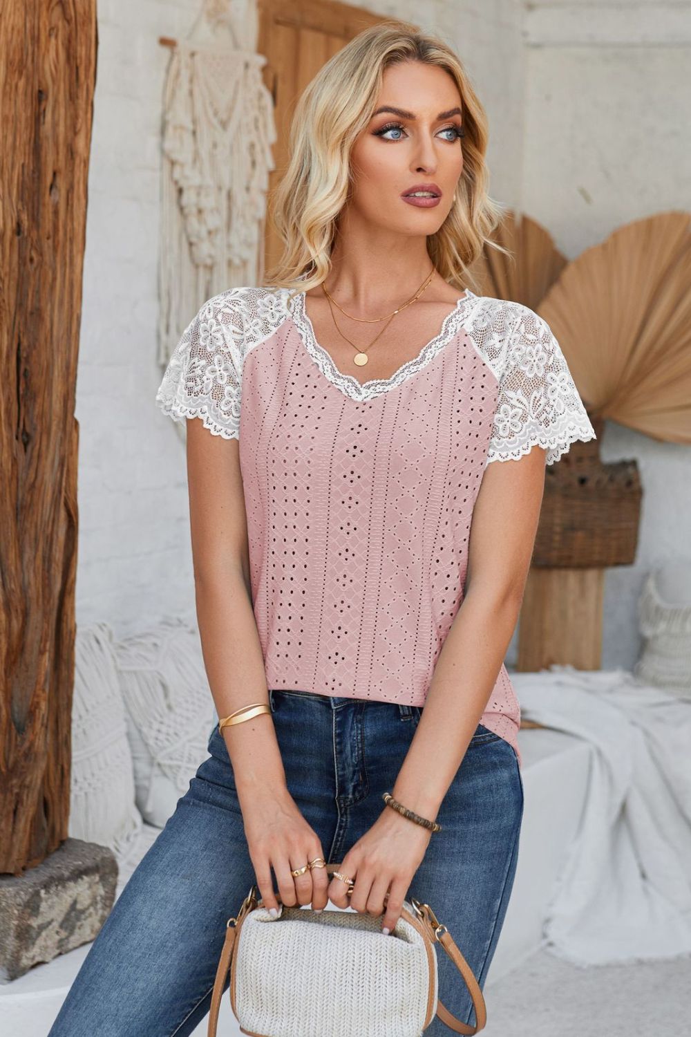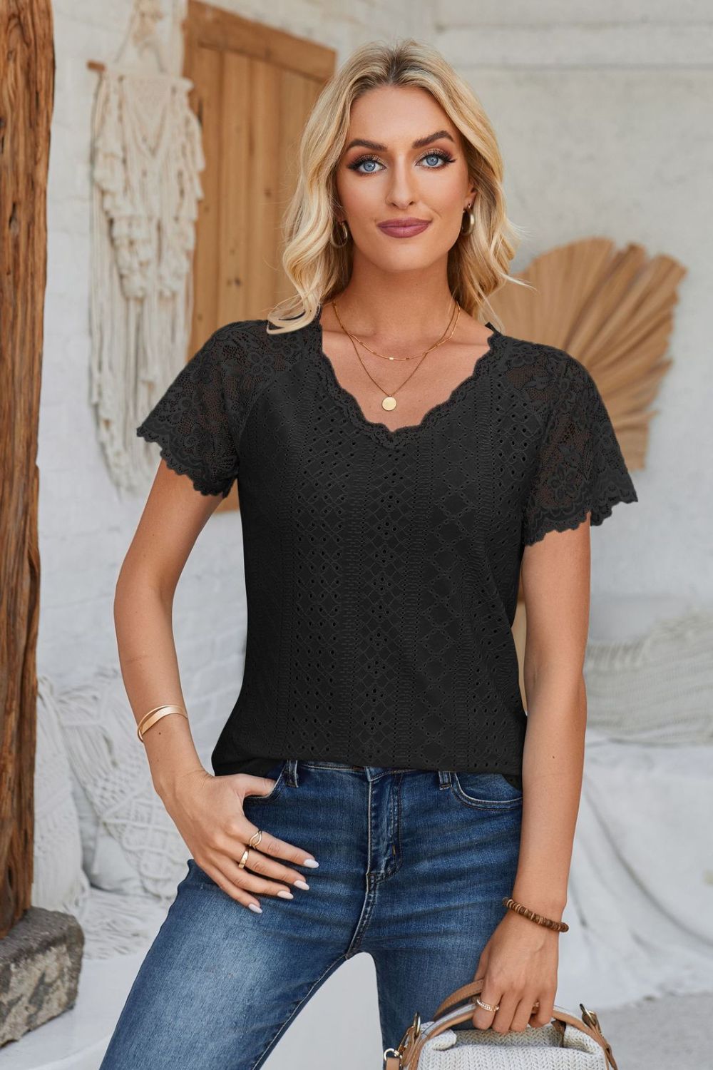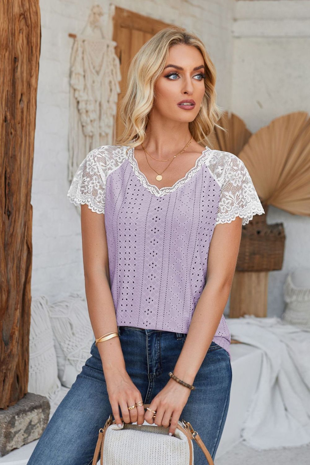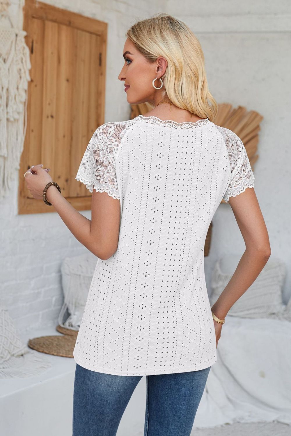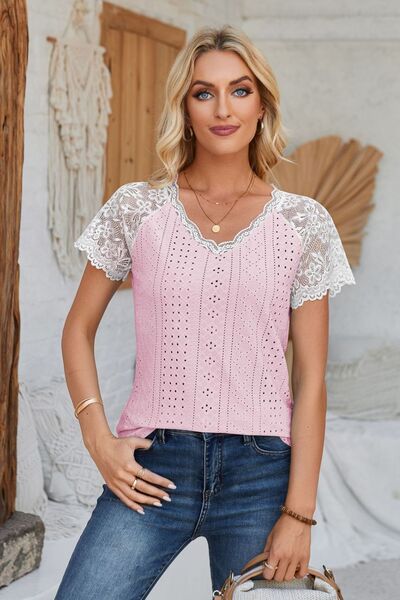 Eyelet V-Neck Lace Short Sleeve T-Shirt