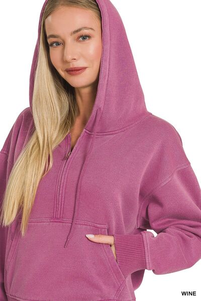 Fleece Pigment Dye Half Zip Kangaroo Pocket Hoodie