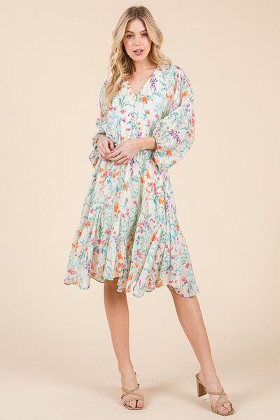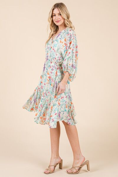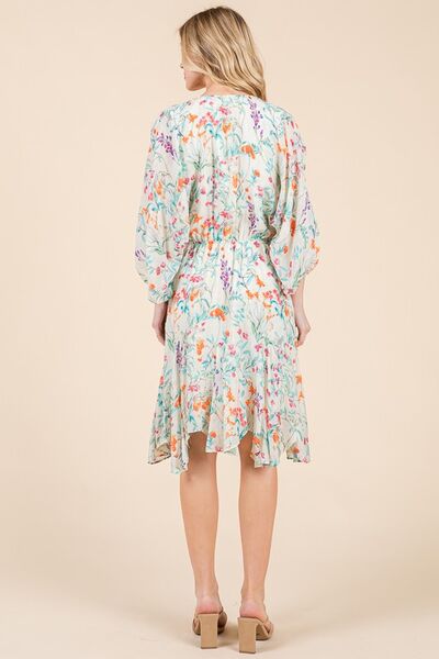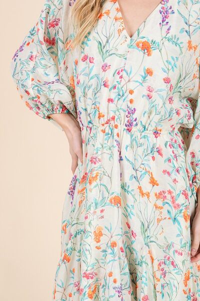 Floral Cinched Waist Balloon Sleeve V-Neck Dress