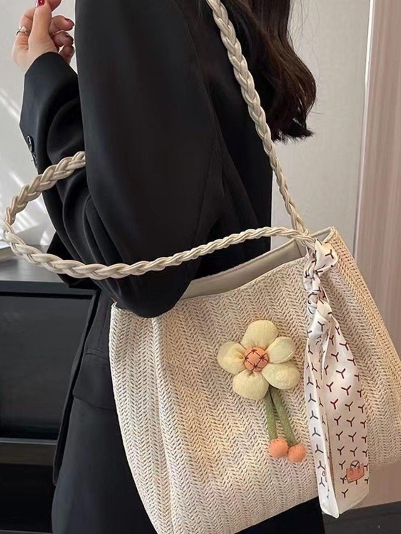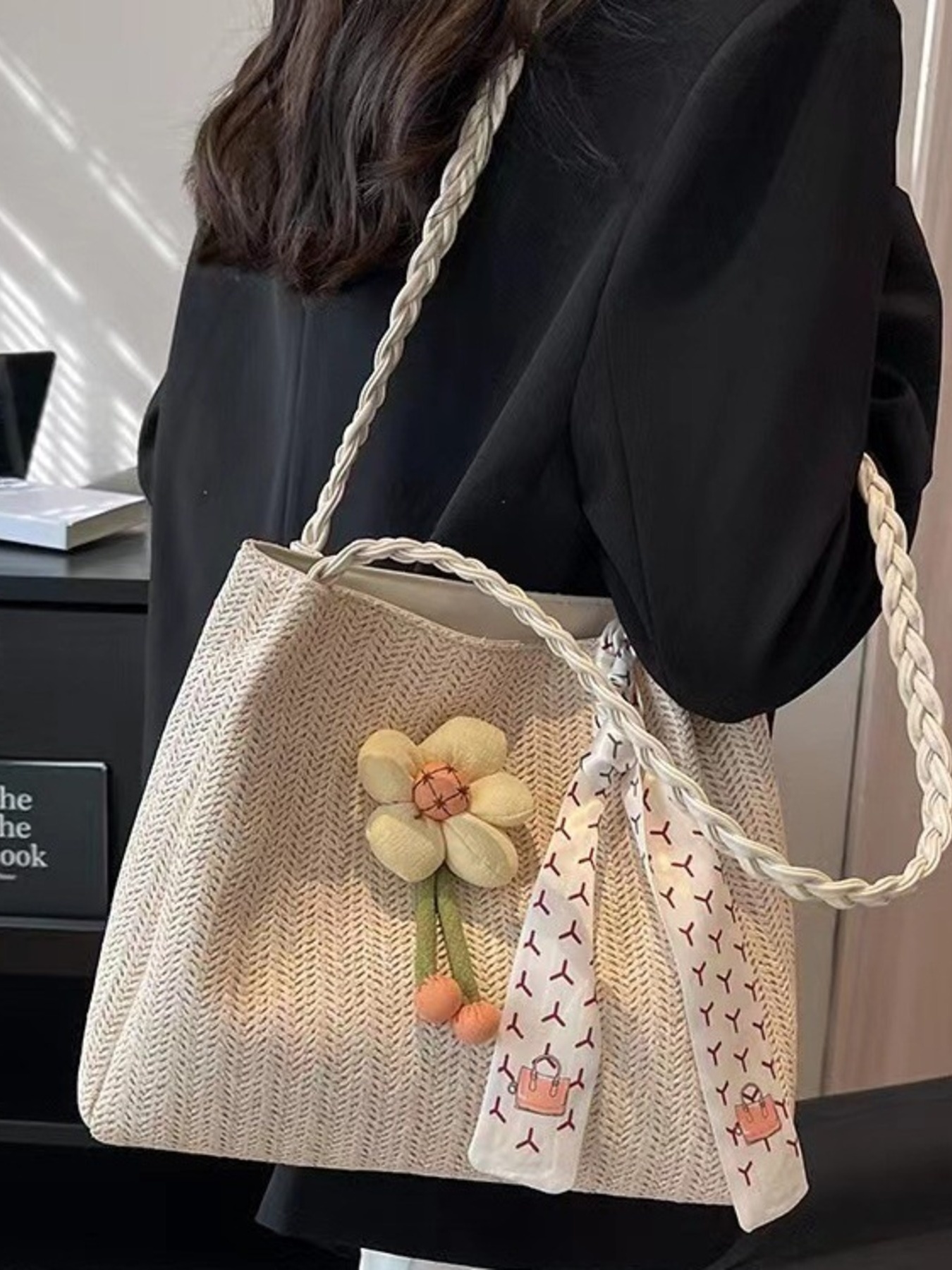 Floral Decor Woven Straw Tote Bag