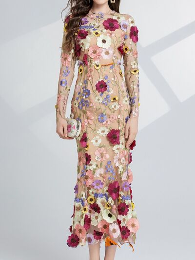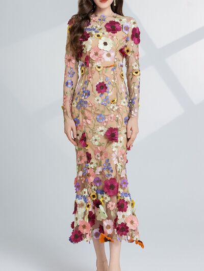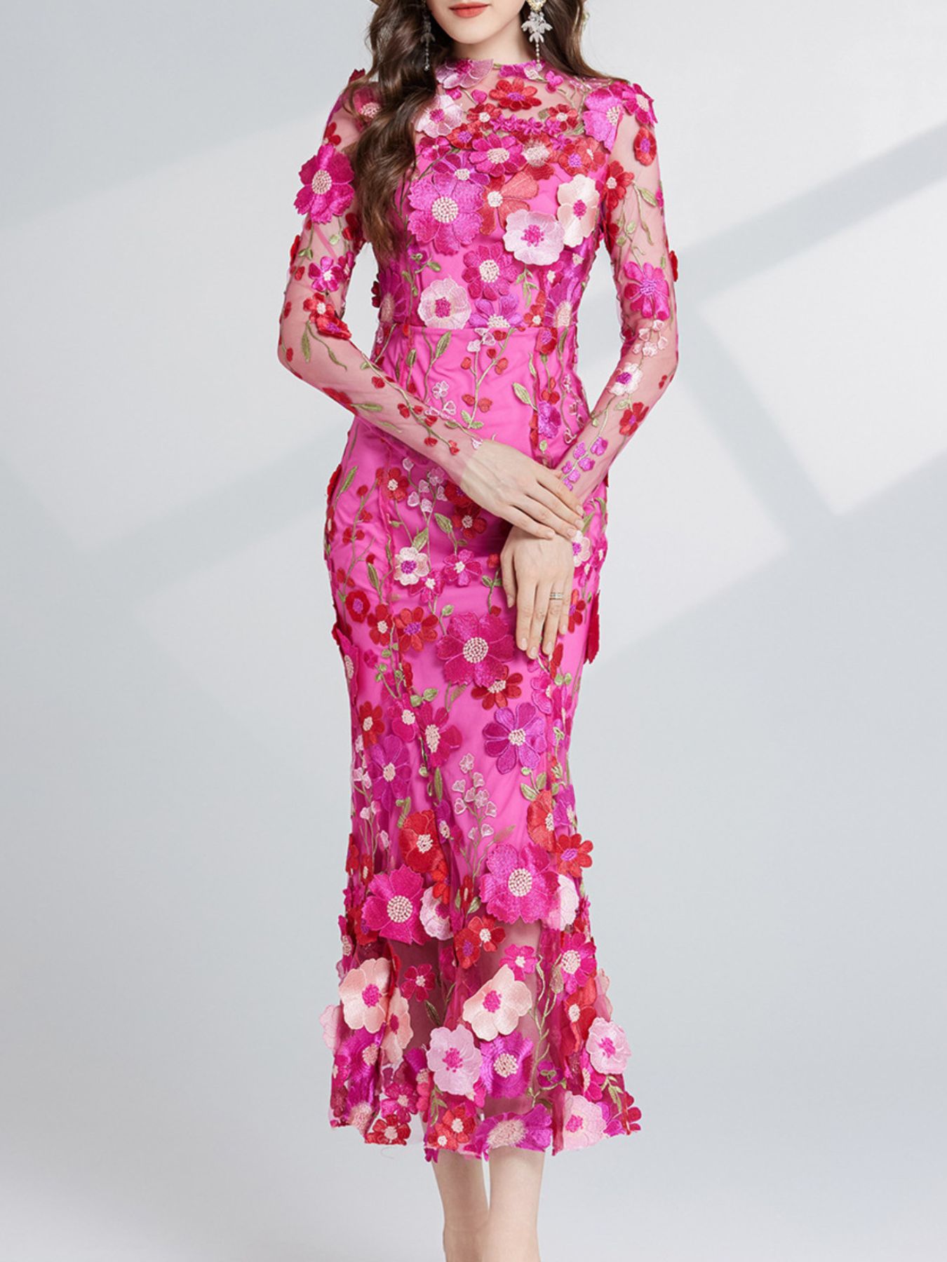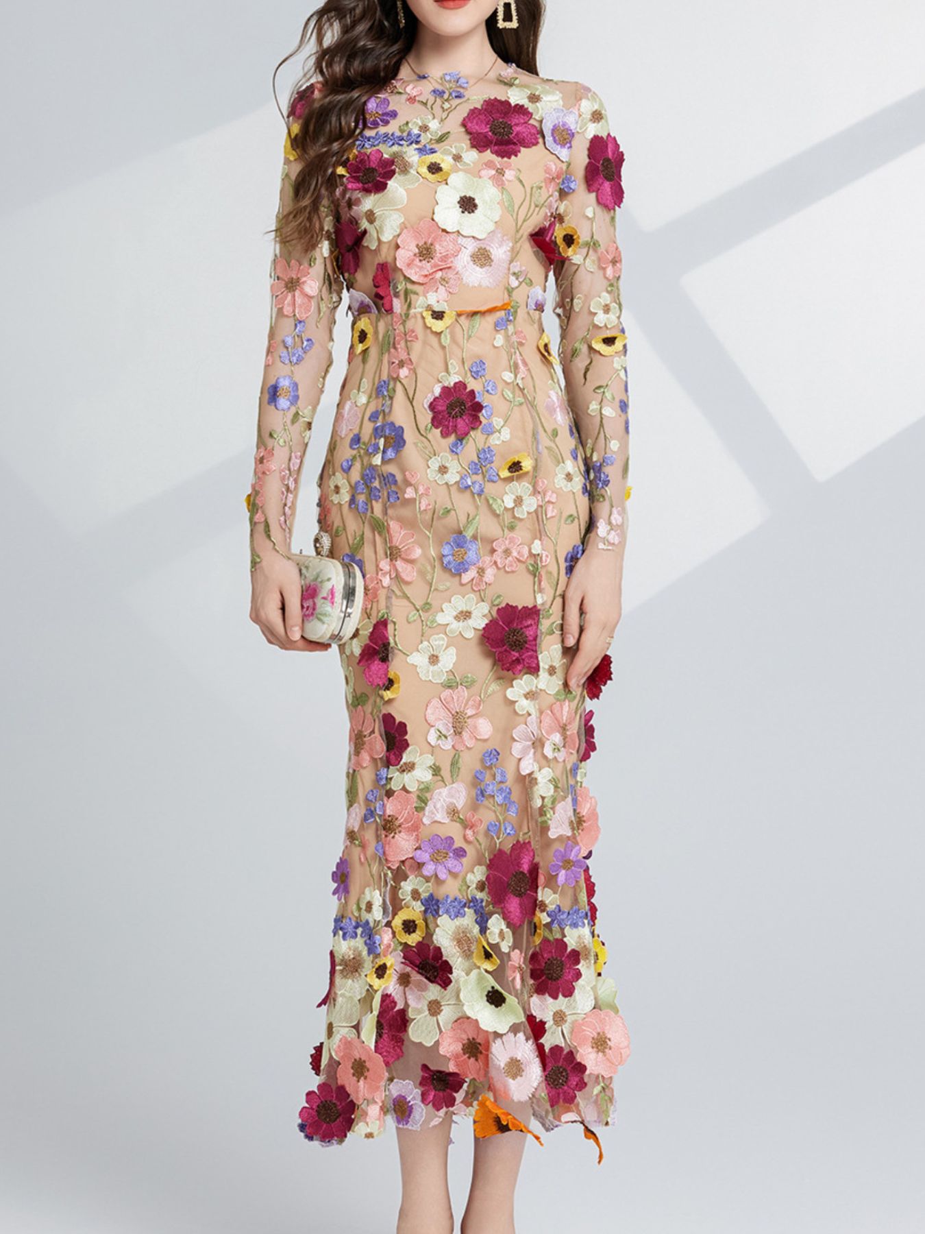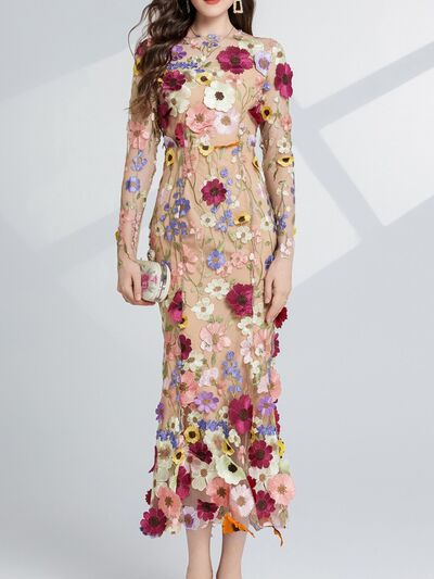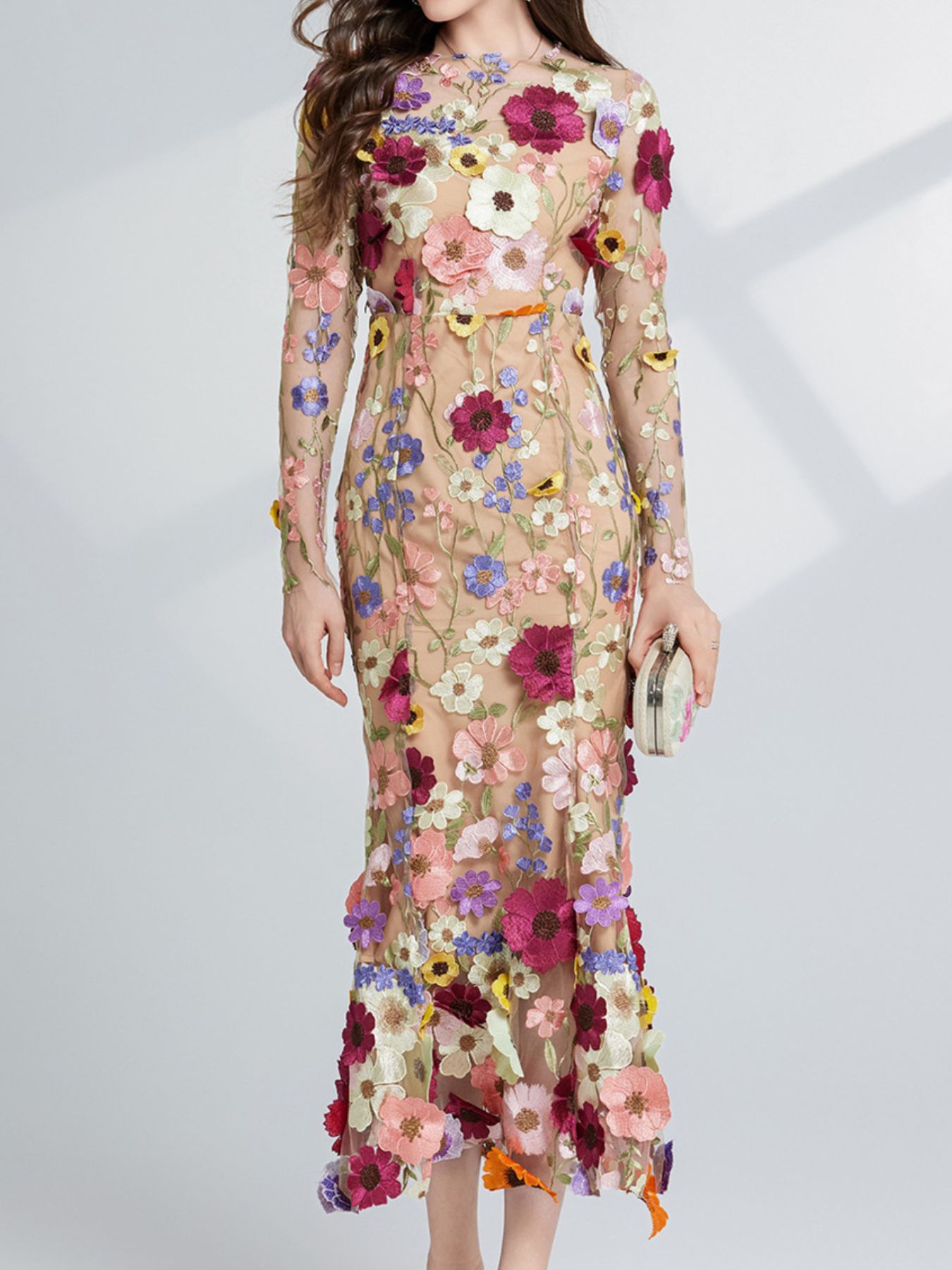 Floral Embroidered Mesh Long Sleeve Midi Dress