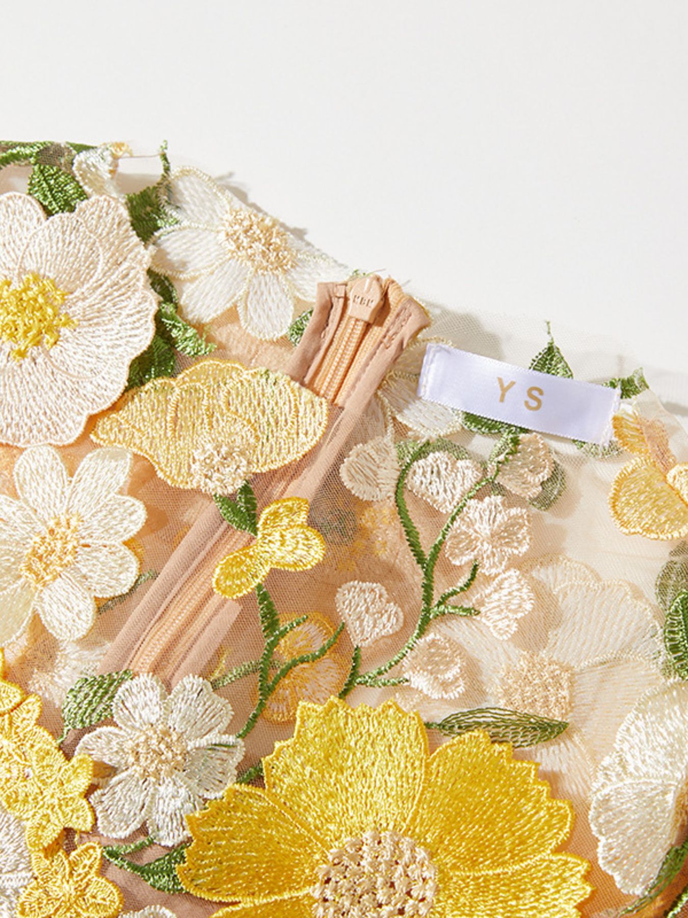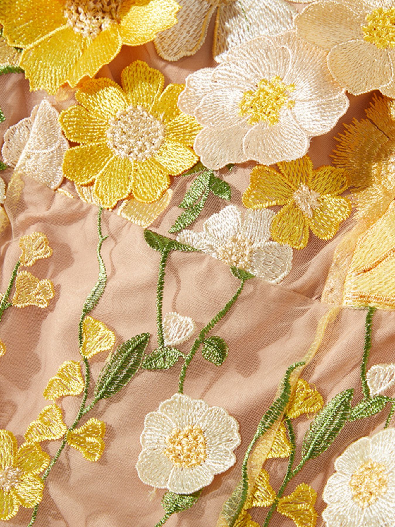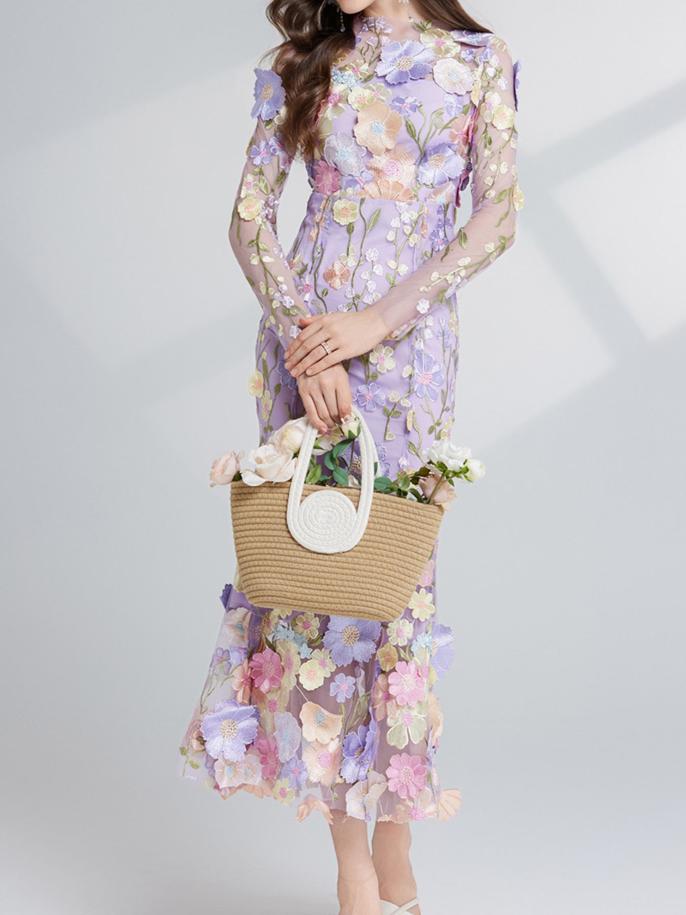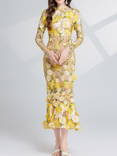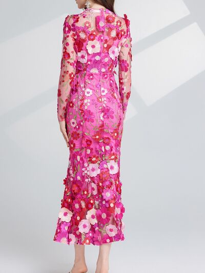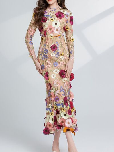 Floral Embroidered Mesh Long Sleeve Midi Dress
