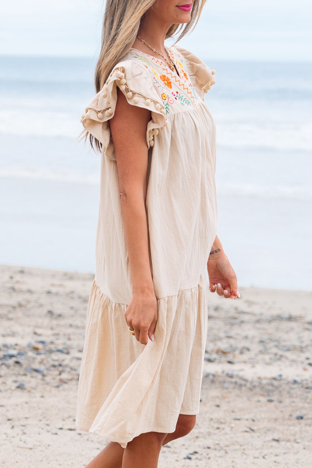 Floral Embroidery Pom Pom Ruffle Sleeves Mini Dress