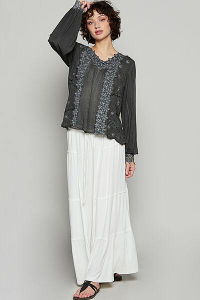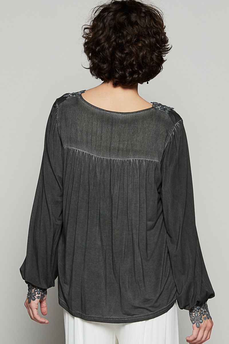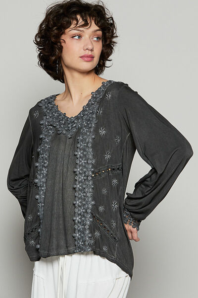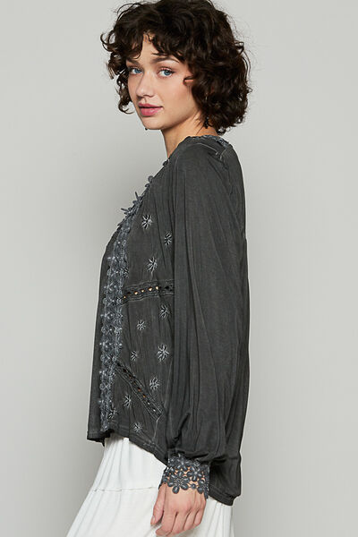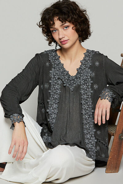 Floral Embroidery Woven Top with Lace Trim