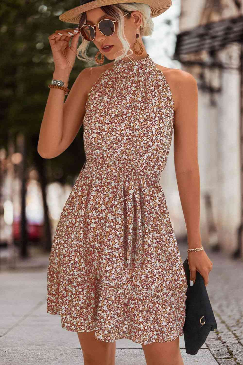 Floral Frill Trim Keyhole Sleeveless Dress