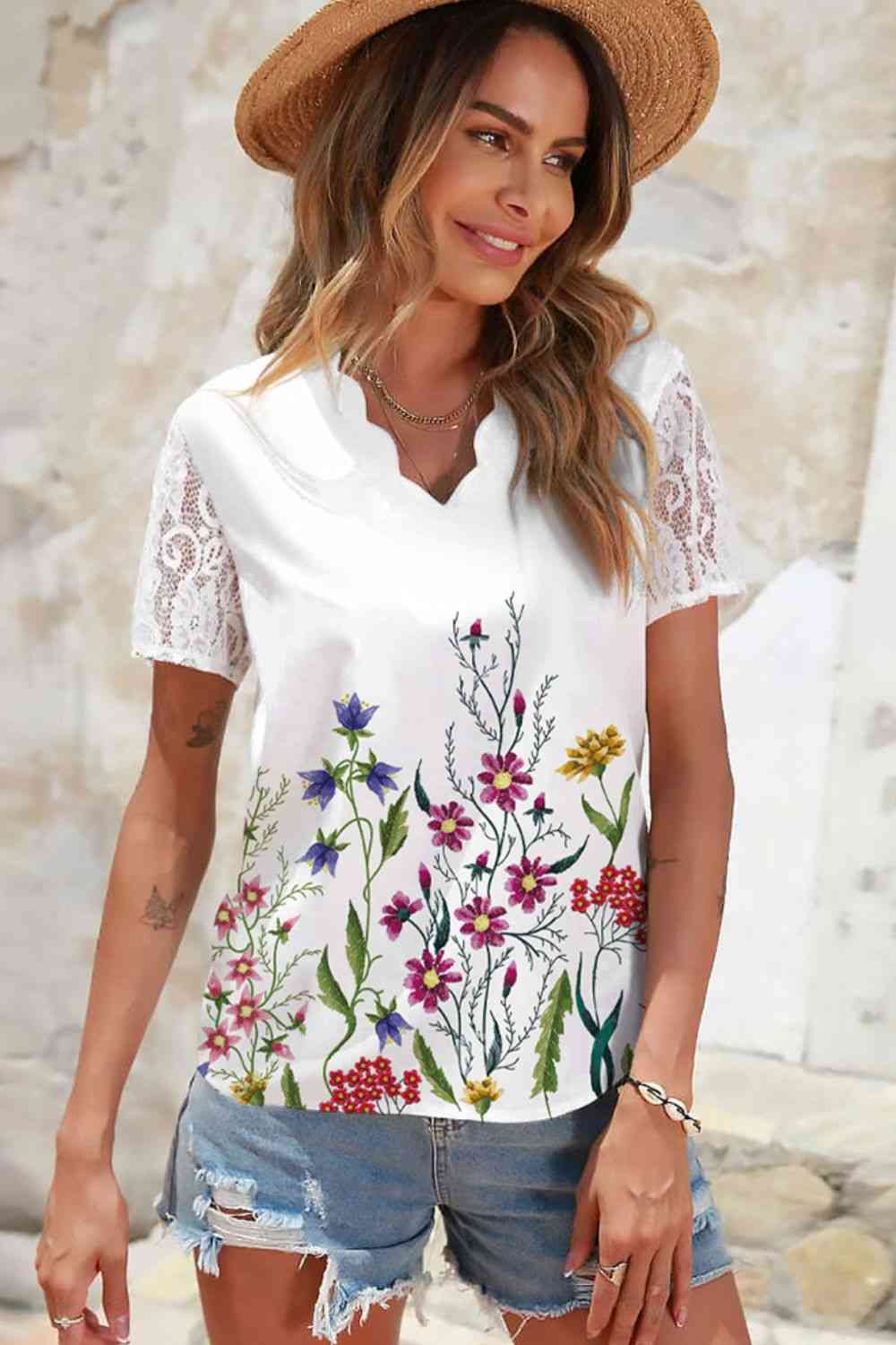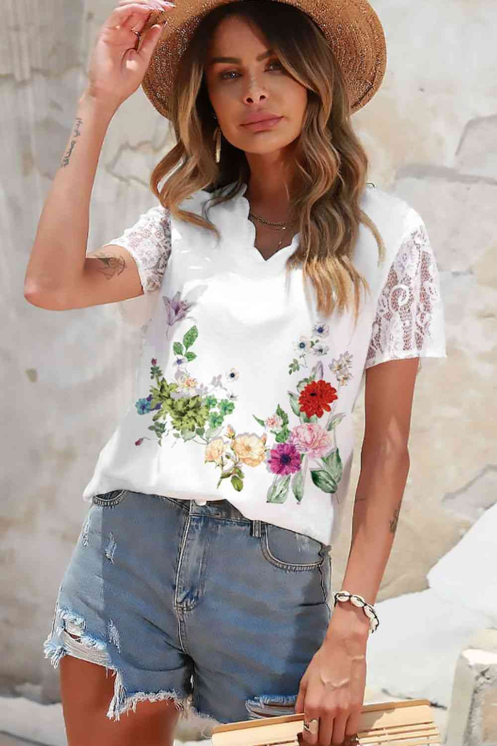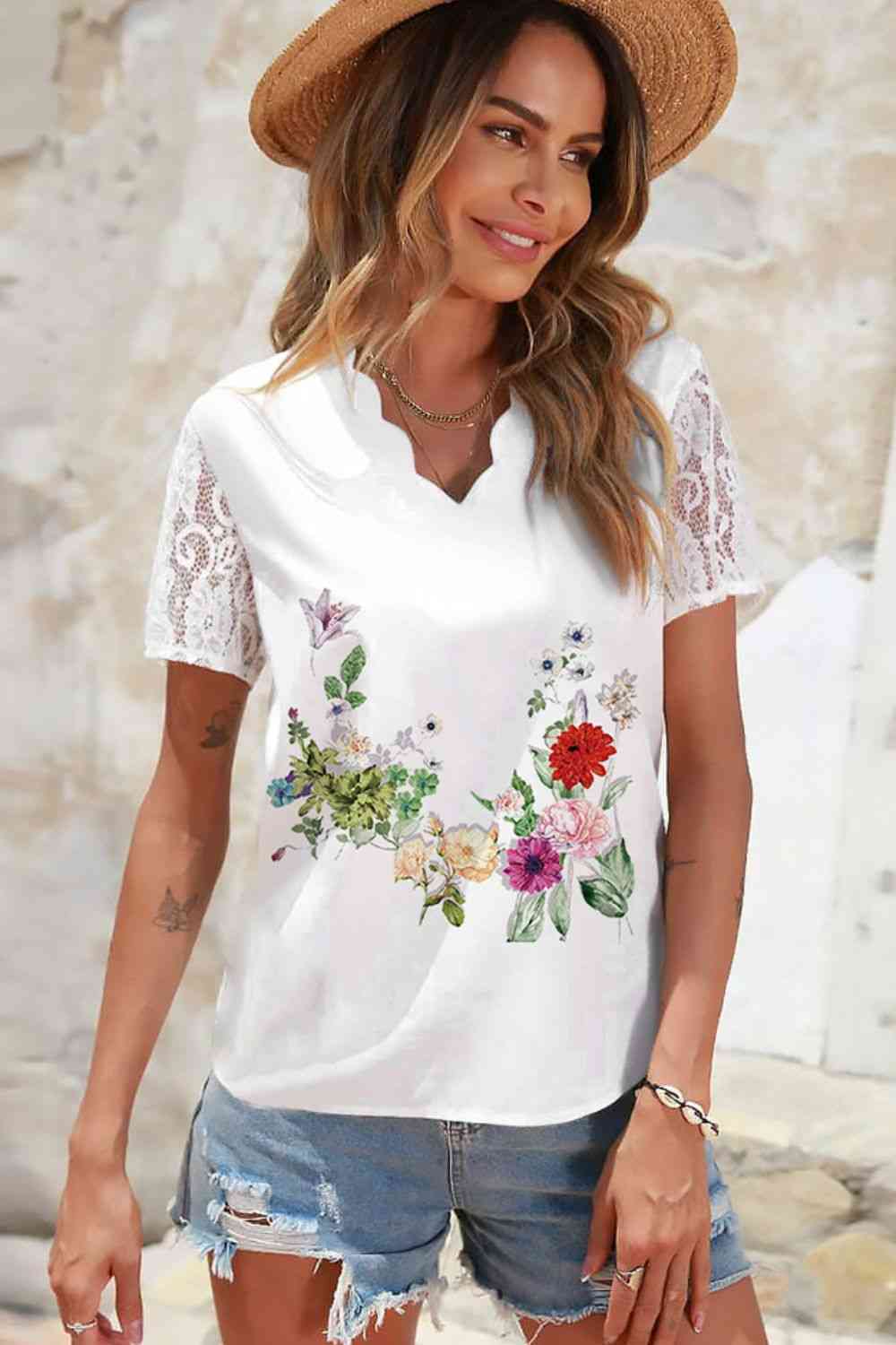 Floral Graphic Scalloped V-Neck Top