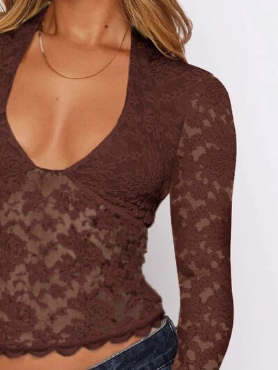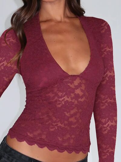 Floral Lace Long Sleeve Deep V-Neck Blouse with Scalloped Hem