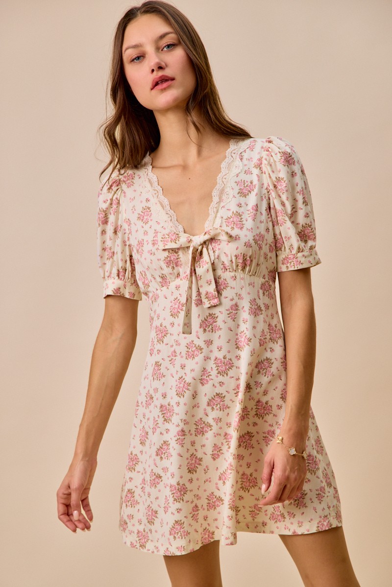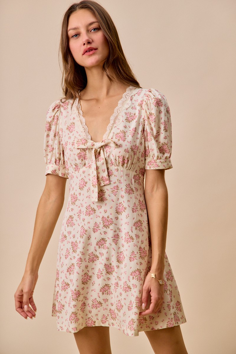 Floral Lace Trimed Short Sleeves Mini Dress