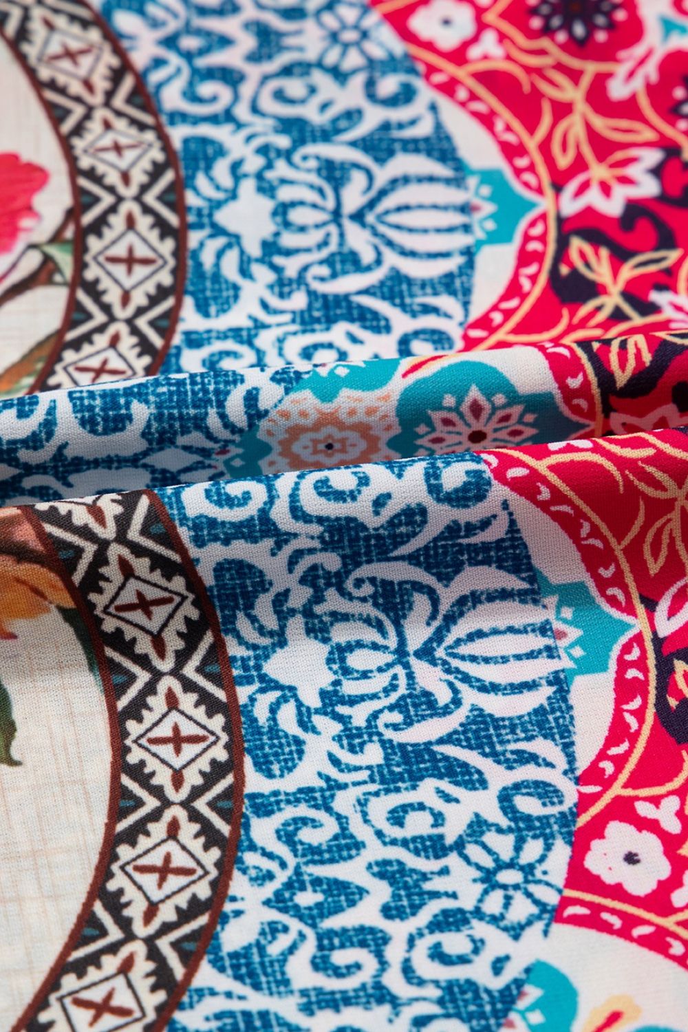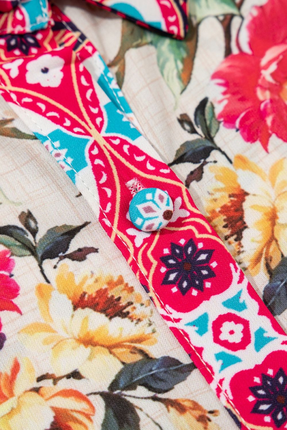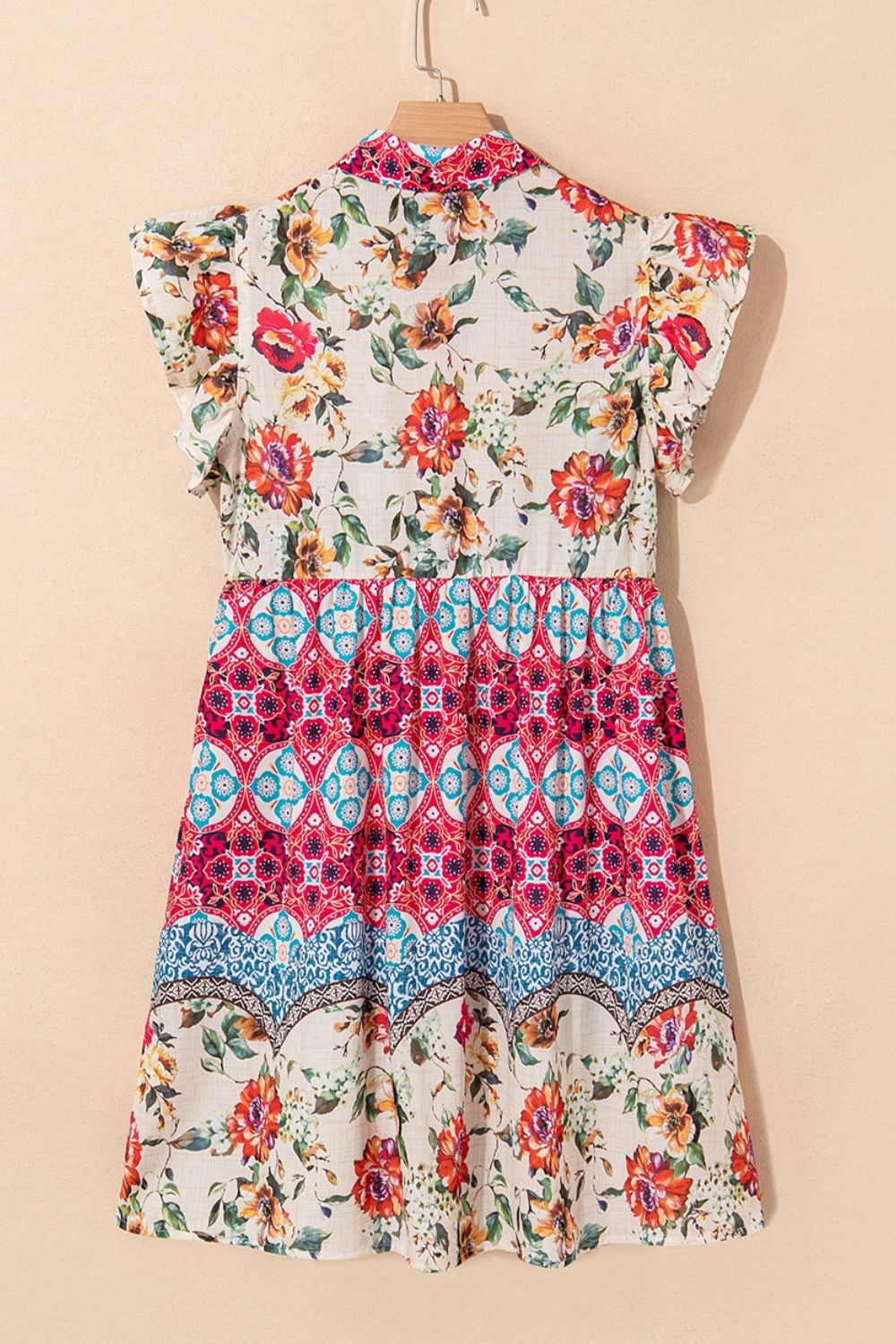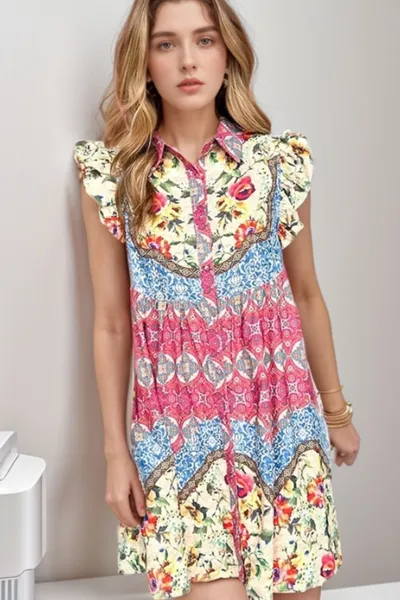 Floral Mixed Pattern Ruffle Flutter Sleeve Buttoned Dress