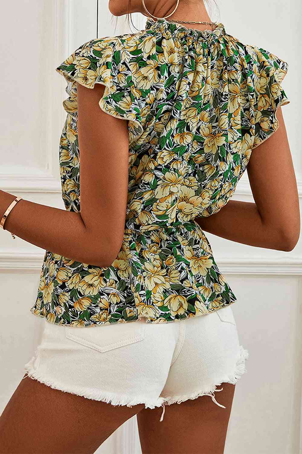 Floral Mock Neck Flutter Sleeve Peplum Top