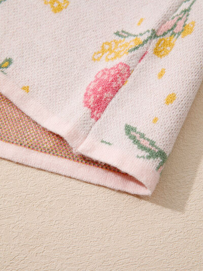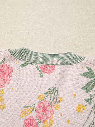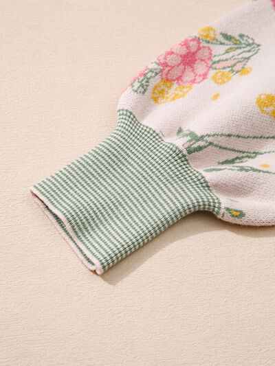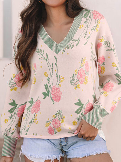 Floral Pattern Striped V Neck Loose Sweater
