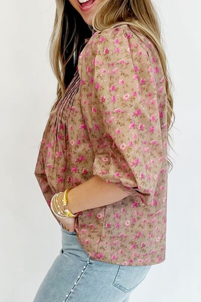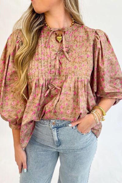 Floral Print Bow Pintuck Bust Half Puff Sleeve Blouse Top
