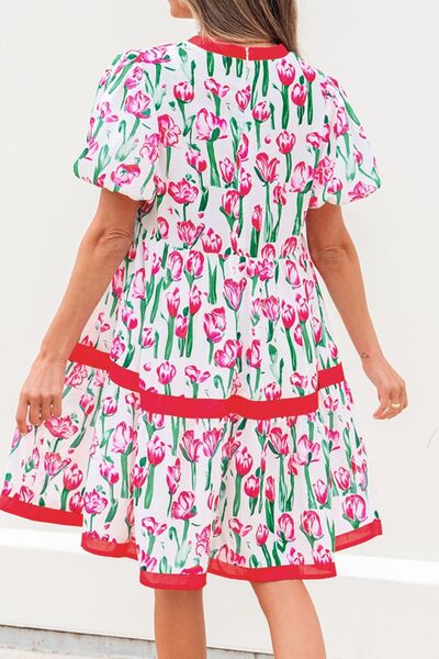 Floral Print Contrast Trim V Neck Bubble Short Sleeve Babydoll Dress
