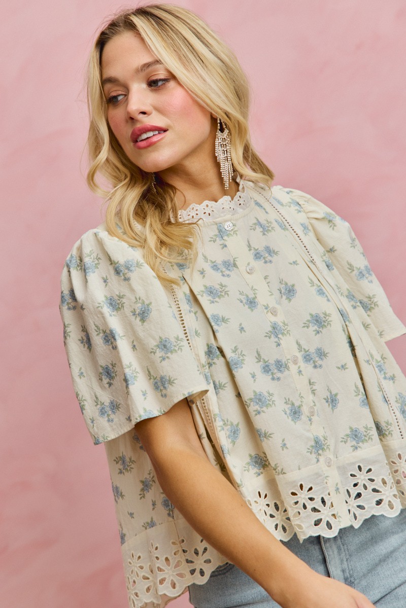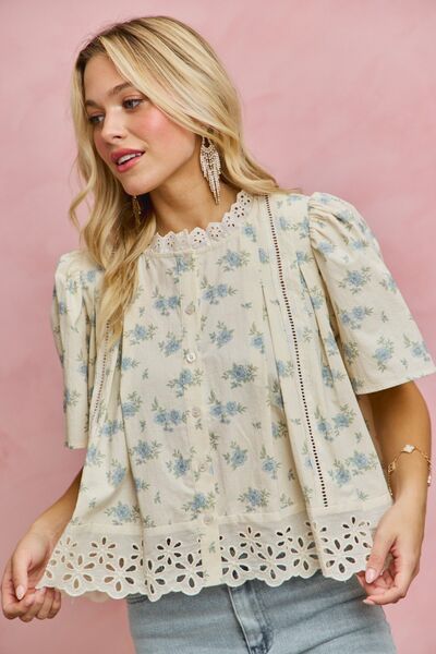 Floral Print Lace Trim Flutter Sleeves Blouse