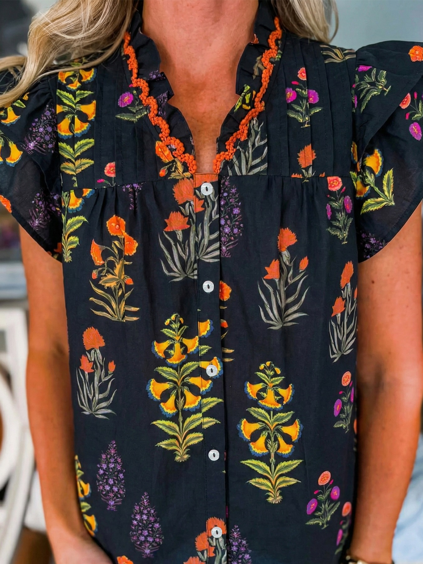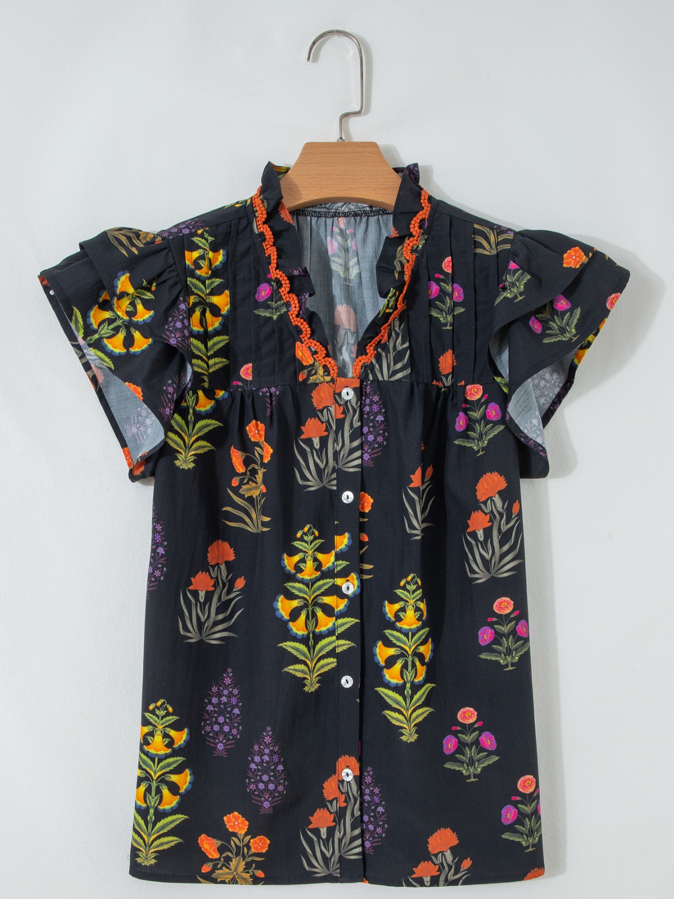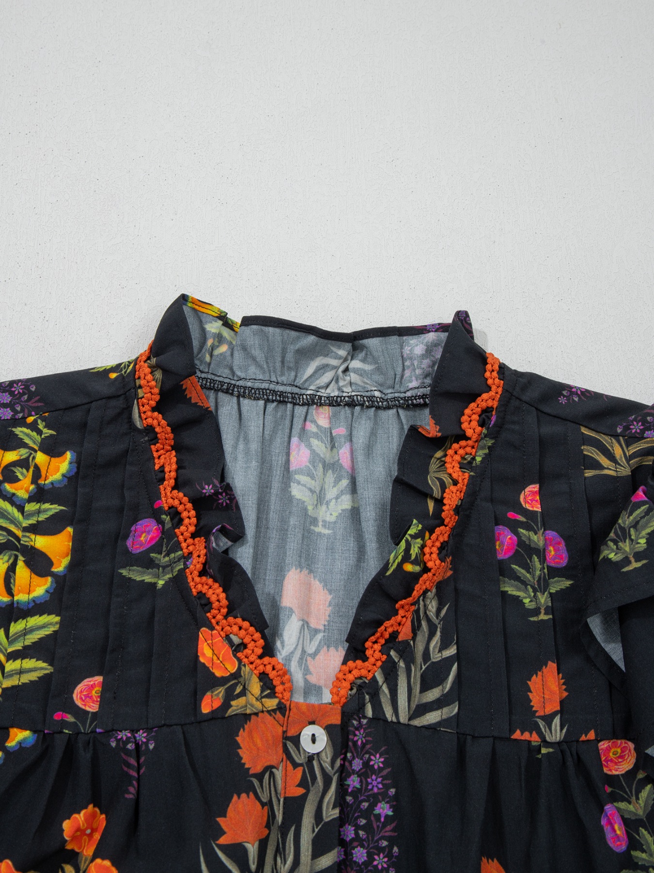 Floral Print Lace Trim Frilled V Neck Short Sleeve Shirt