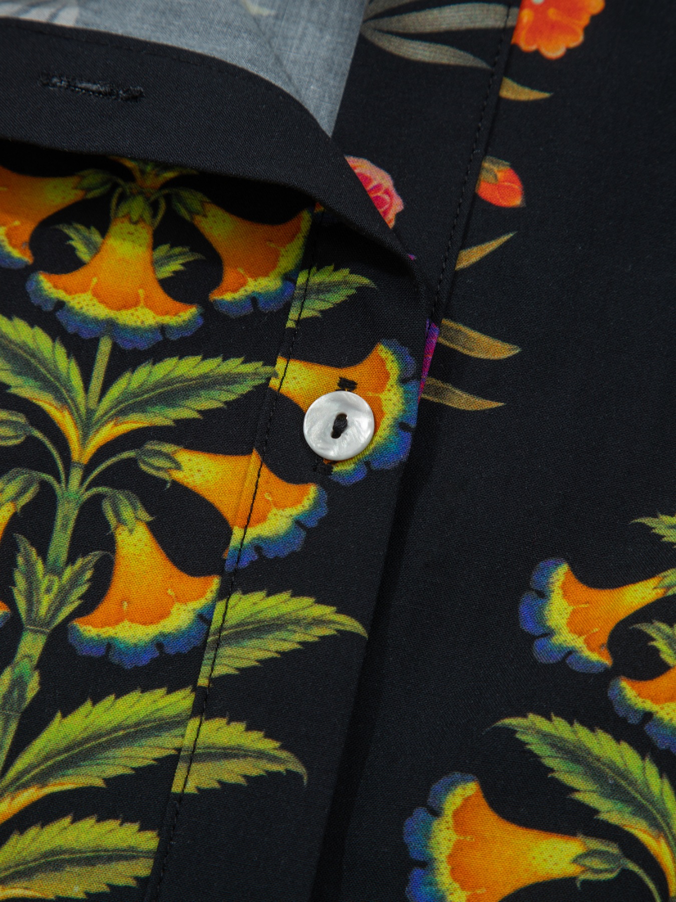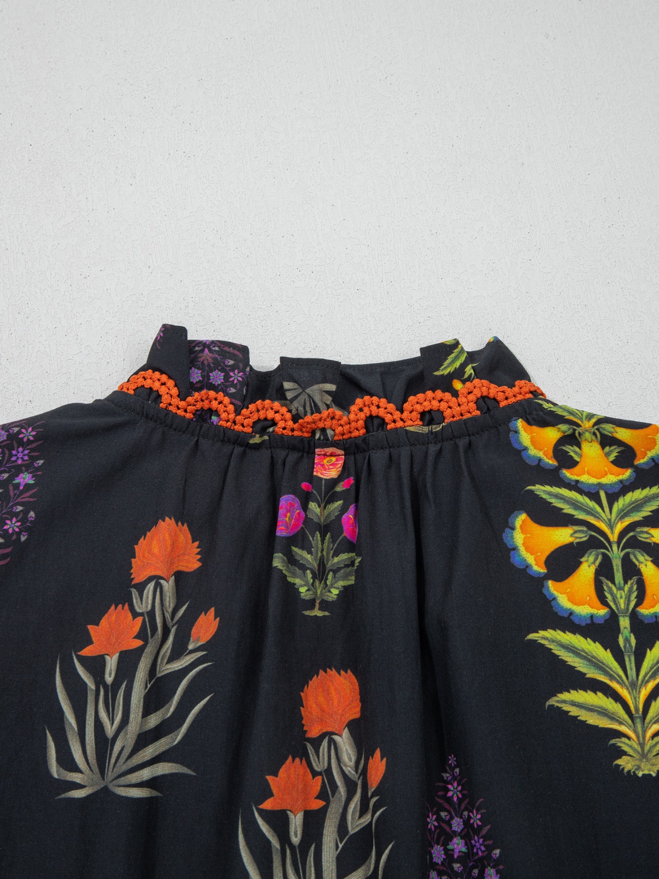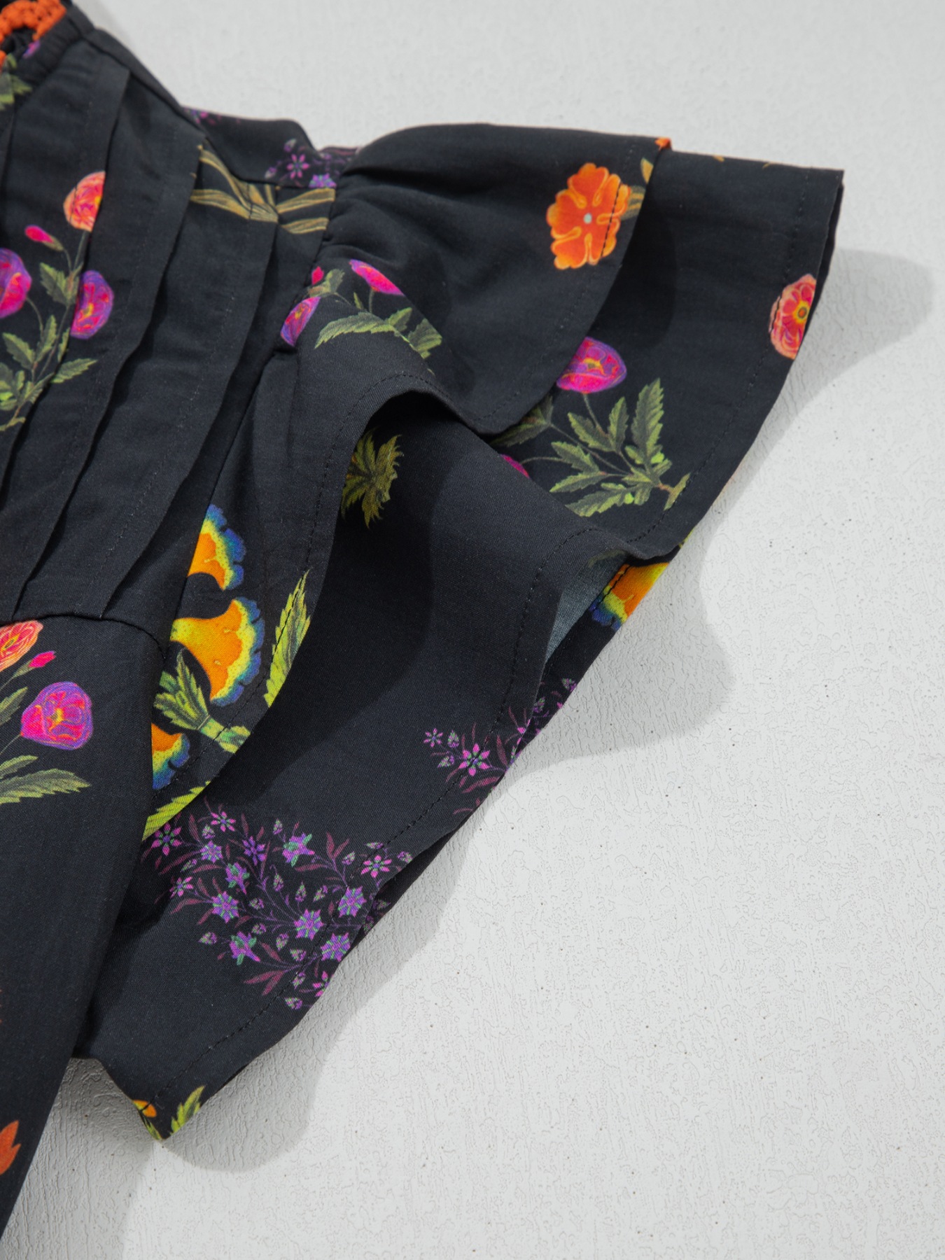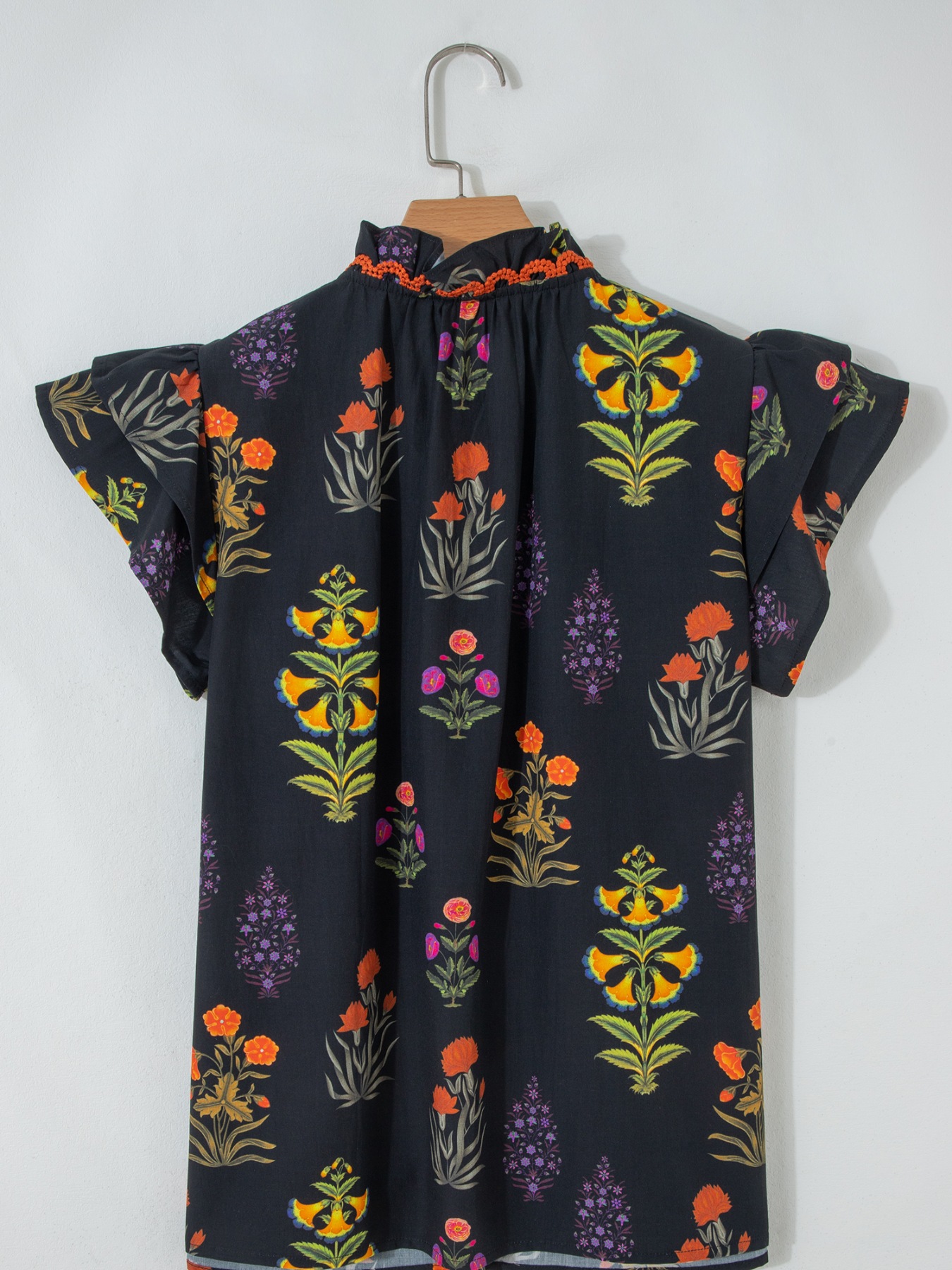 Floral Print Lace Trim Frilled V Neck Short Sleeve Shirt