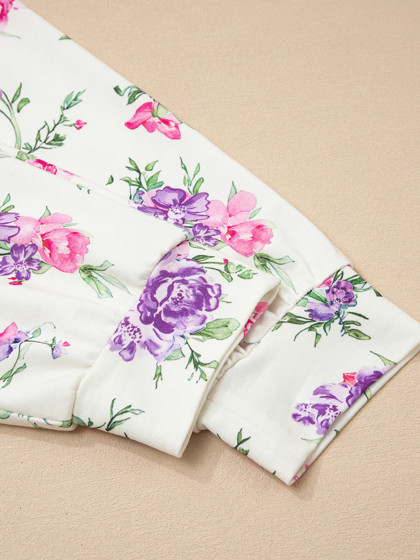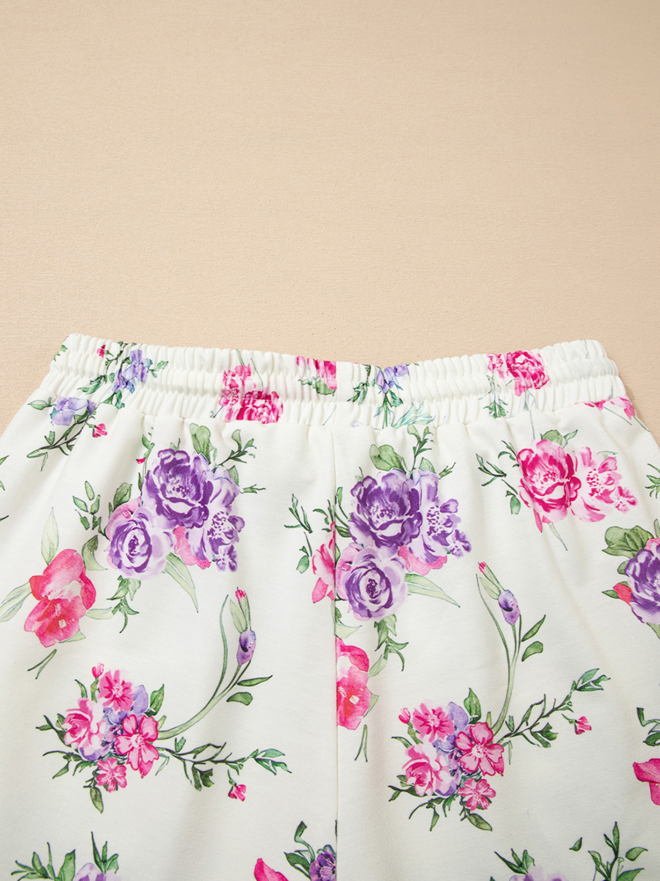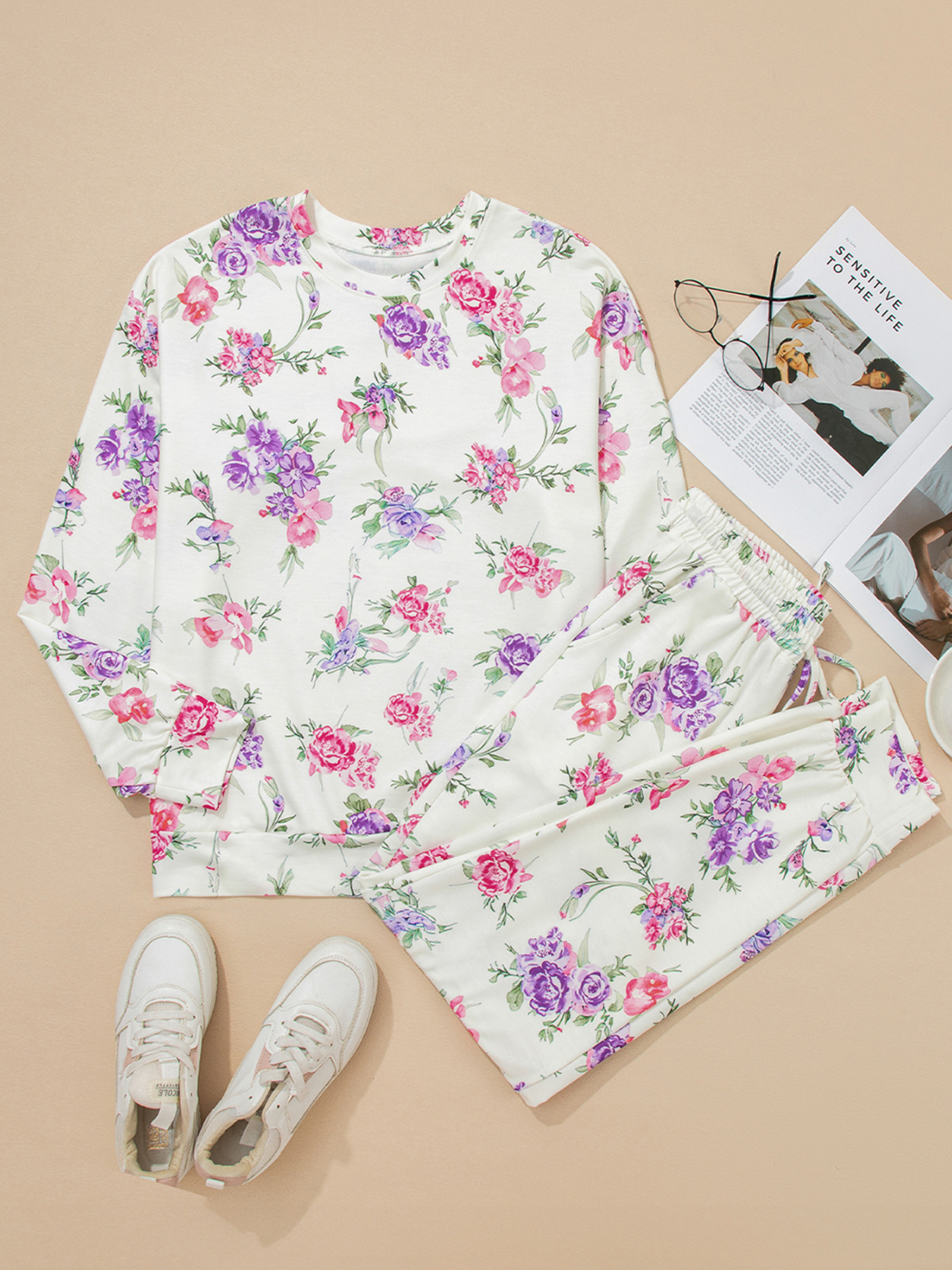 Floral Print Round Neck Top and Drawstring Pants Lounge Set