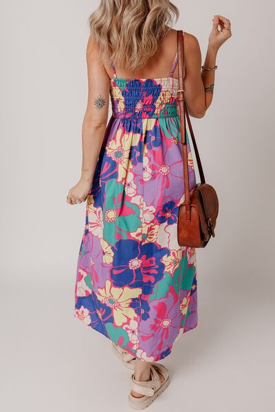 Floral Print Shirred Spaghetti Strap Loose Maxi Dress