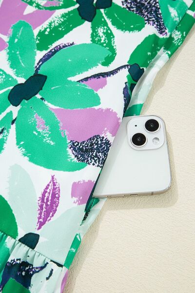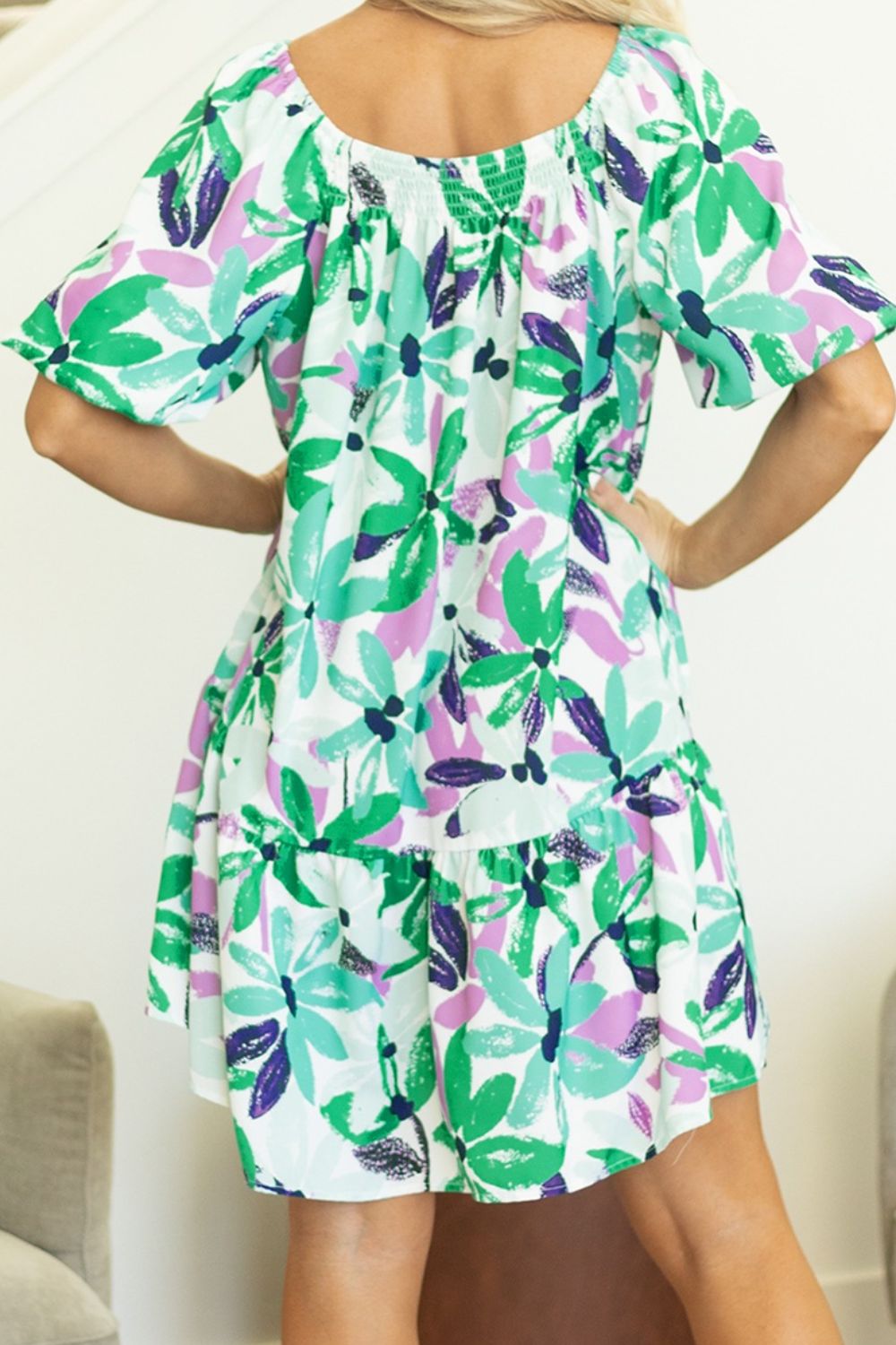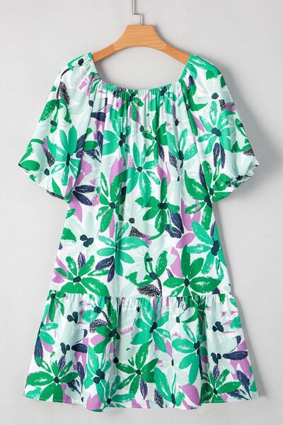 Floral Print Shirred Square Neck Loose Fit Mini Dress