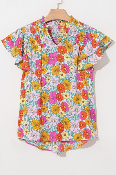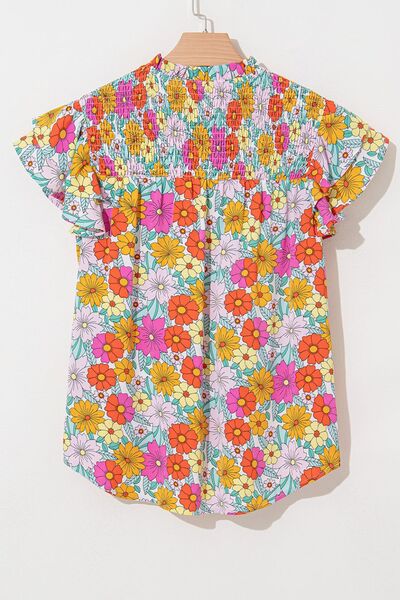 Floral Print Shirred Tiered Ruffled Sleeve Blouse