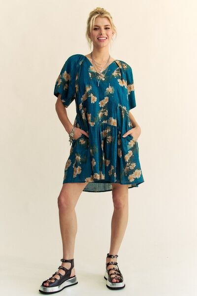 Floral Print Short Bell Sleeve Pleated Mini Dress