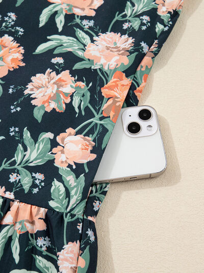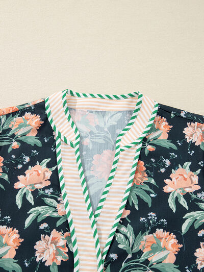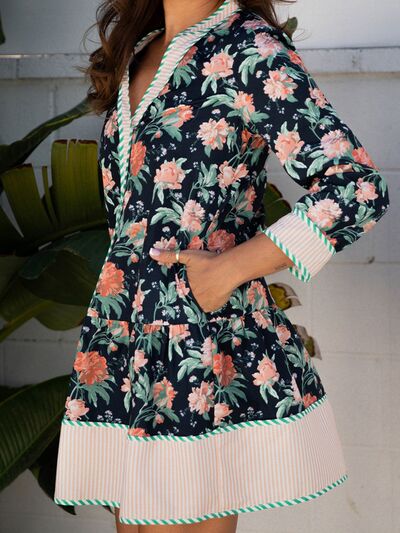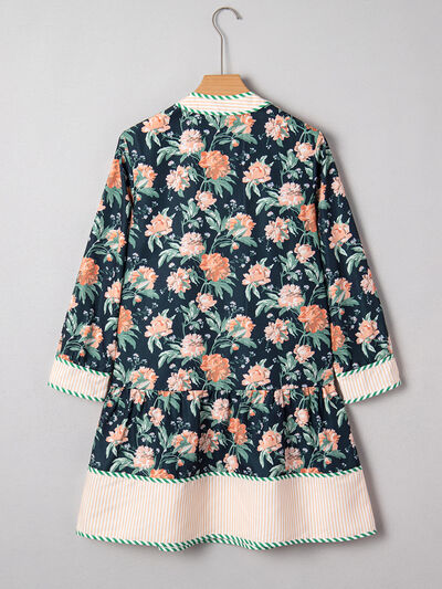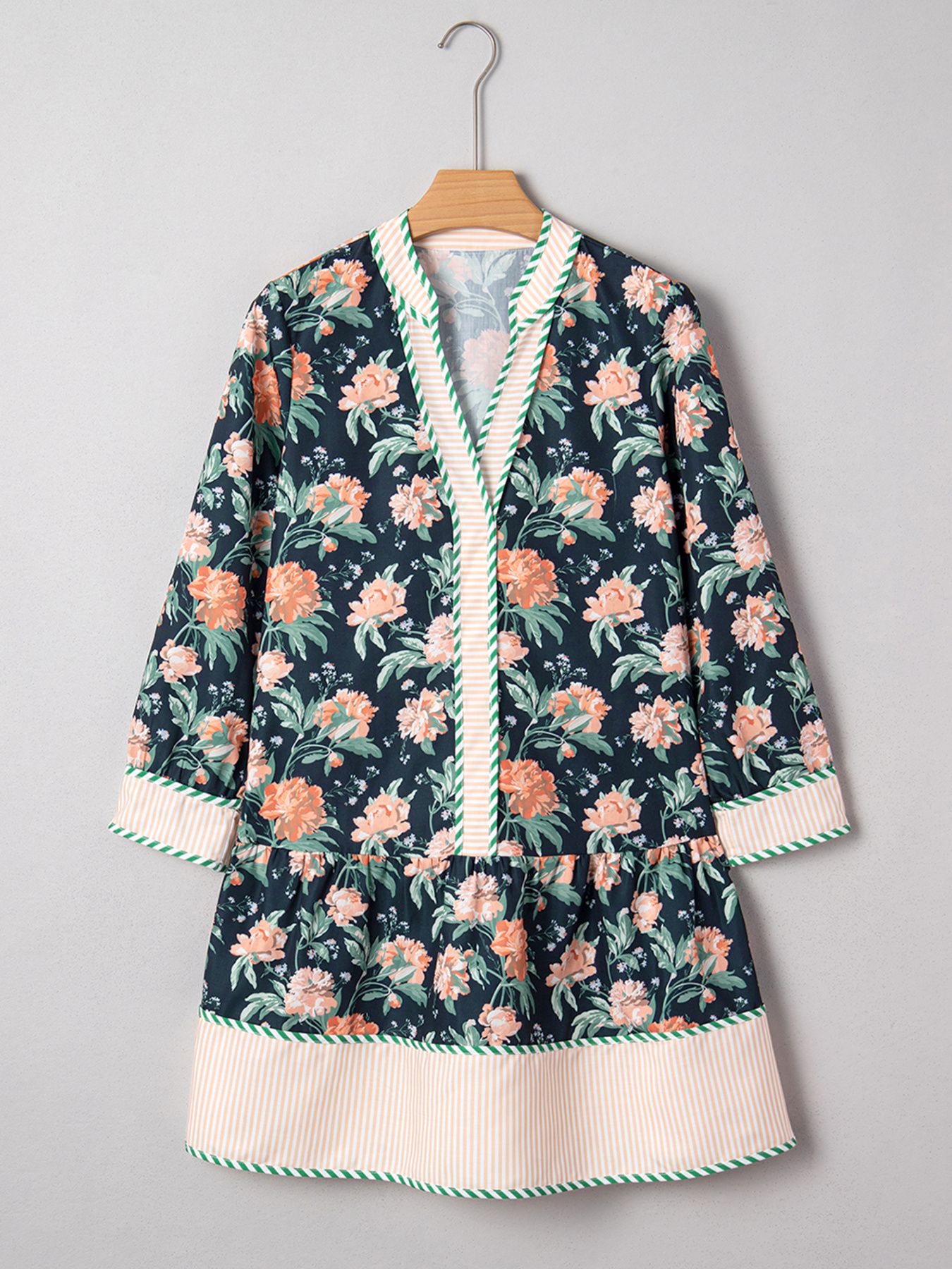 Floral Print Striped Trim V Neck Long Sleeve Ruffle Hem Shift Mini Dress