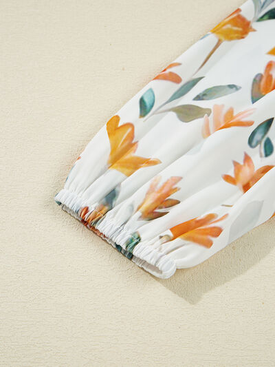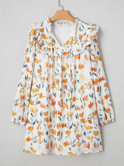 Floral Print Tie Neck Frilled Detail Long Sleeve Mini Dress