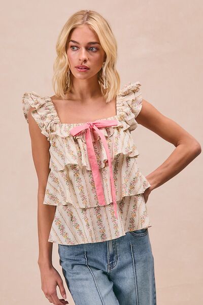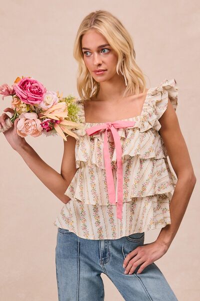 Floral Printed Woven Front Bow Tied Ruffled Square Neck Sleeveless Top