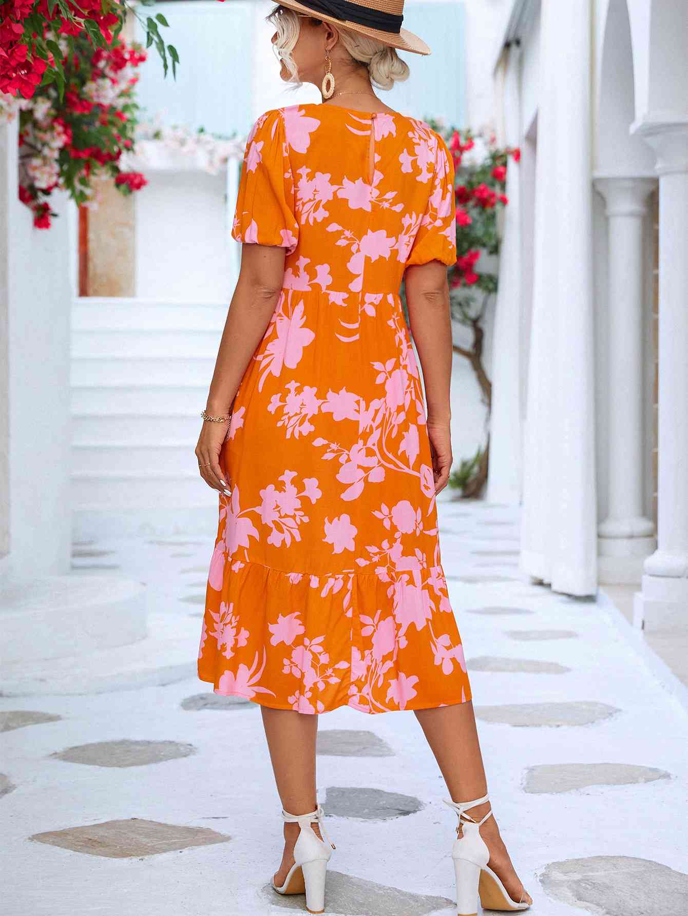 Floral Puff Sleeve Ruffle Hem Midi Dress