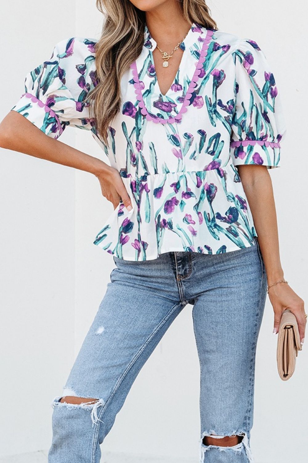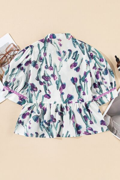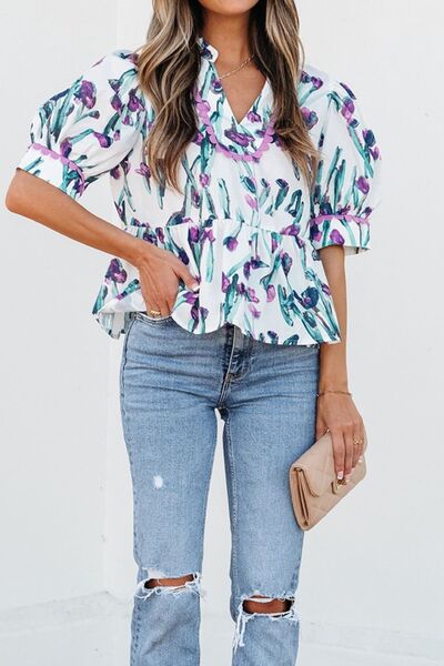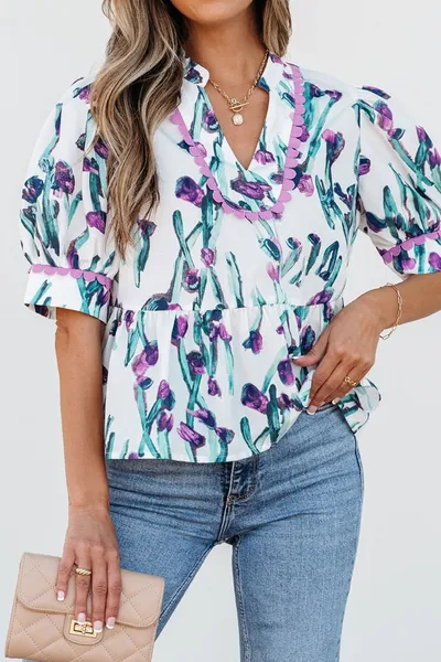 Floral Ricrac Trim Half Sleeve Peplum Top
