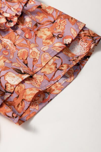 Floral Ruffled Layered Short Sleeve Tie Neck Blouse