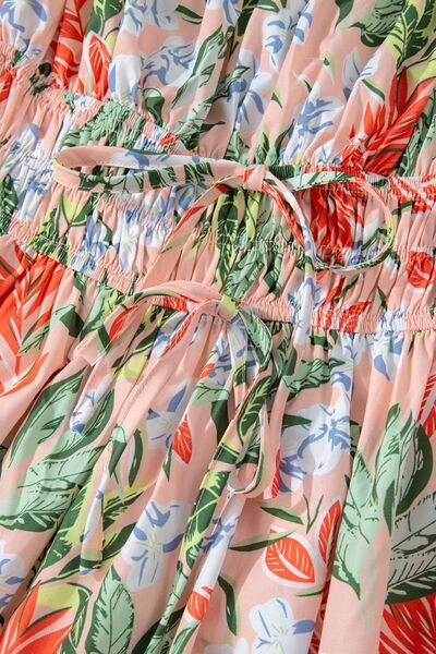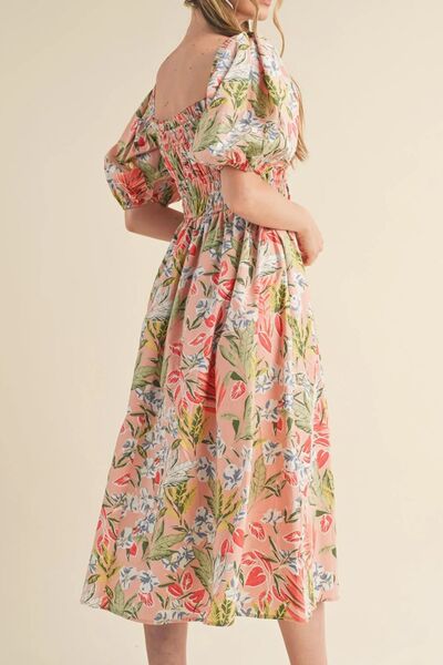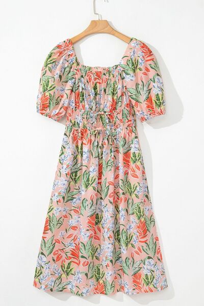 Floral Smocked Square Neck Puff Short Sleeve Midi Dress