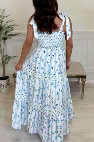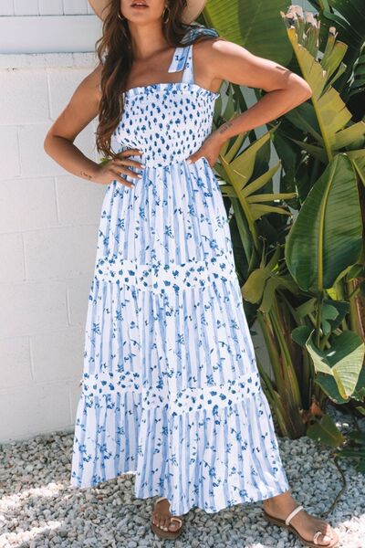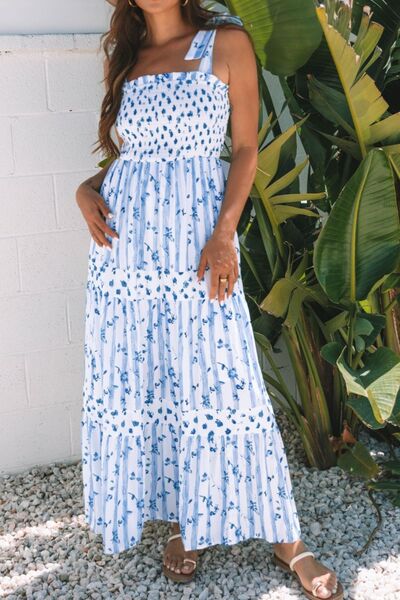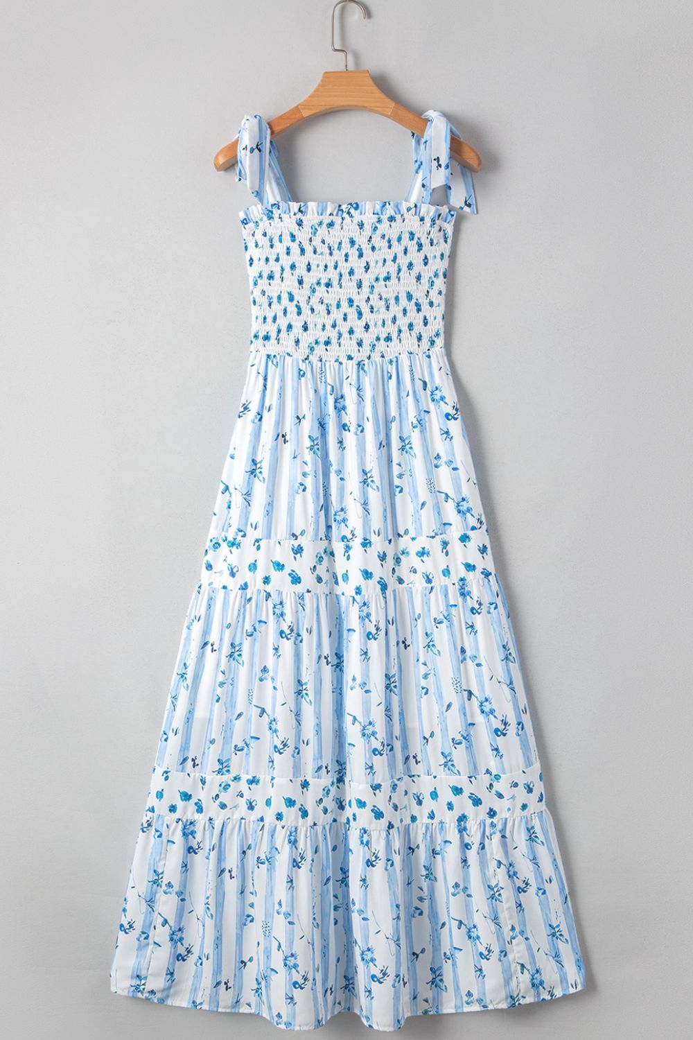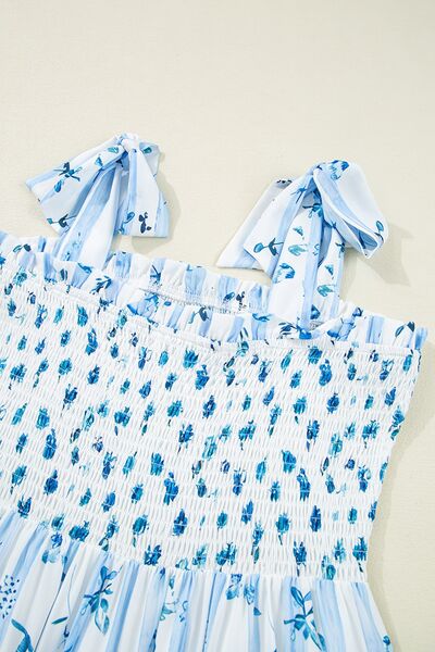 Floral Smocked Tied Straps A-Lined Tiered Dress