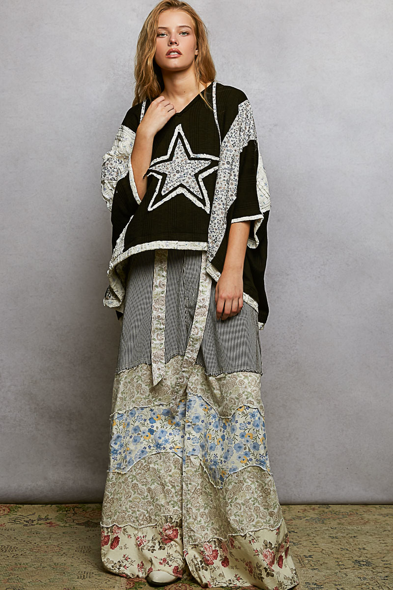 Floral Star Patch Hooded Blouse with Lace Contrast Detail