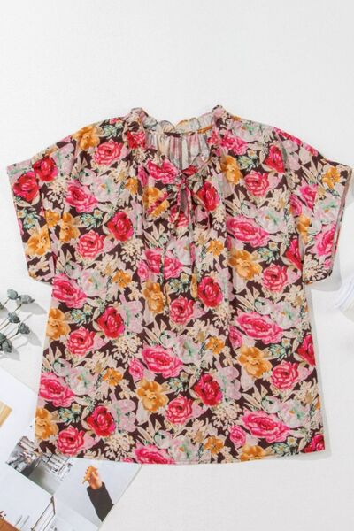 Floral Tie Neck Short Sleeve Blouse