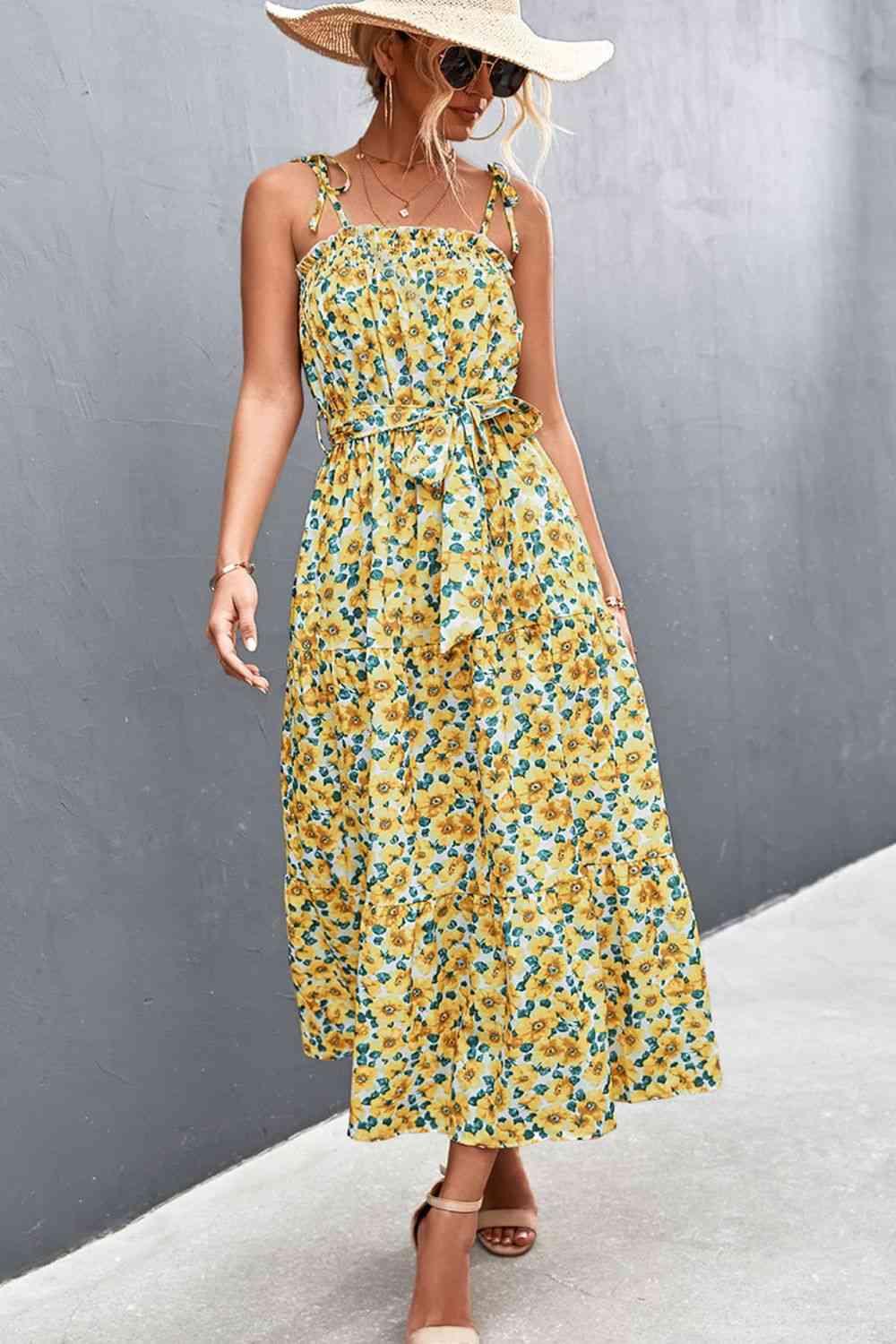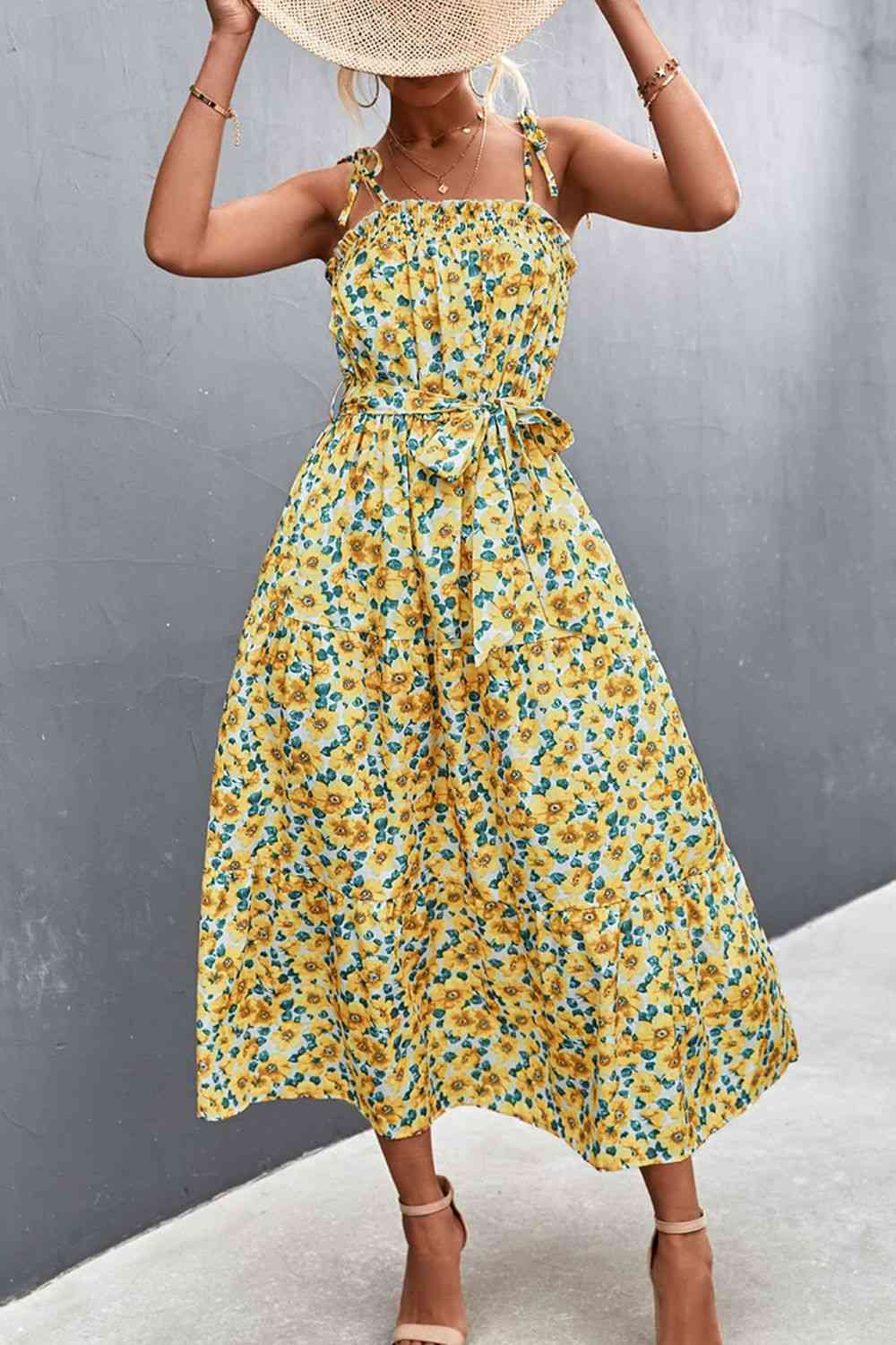 Floral Tie-Shoulder Belted Dress