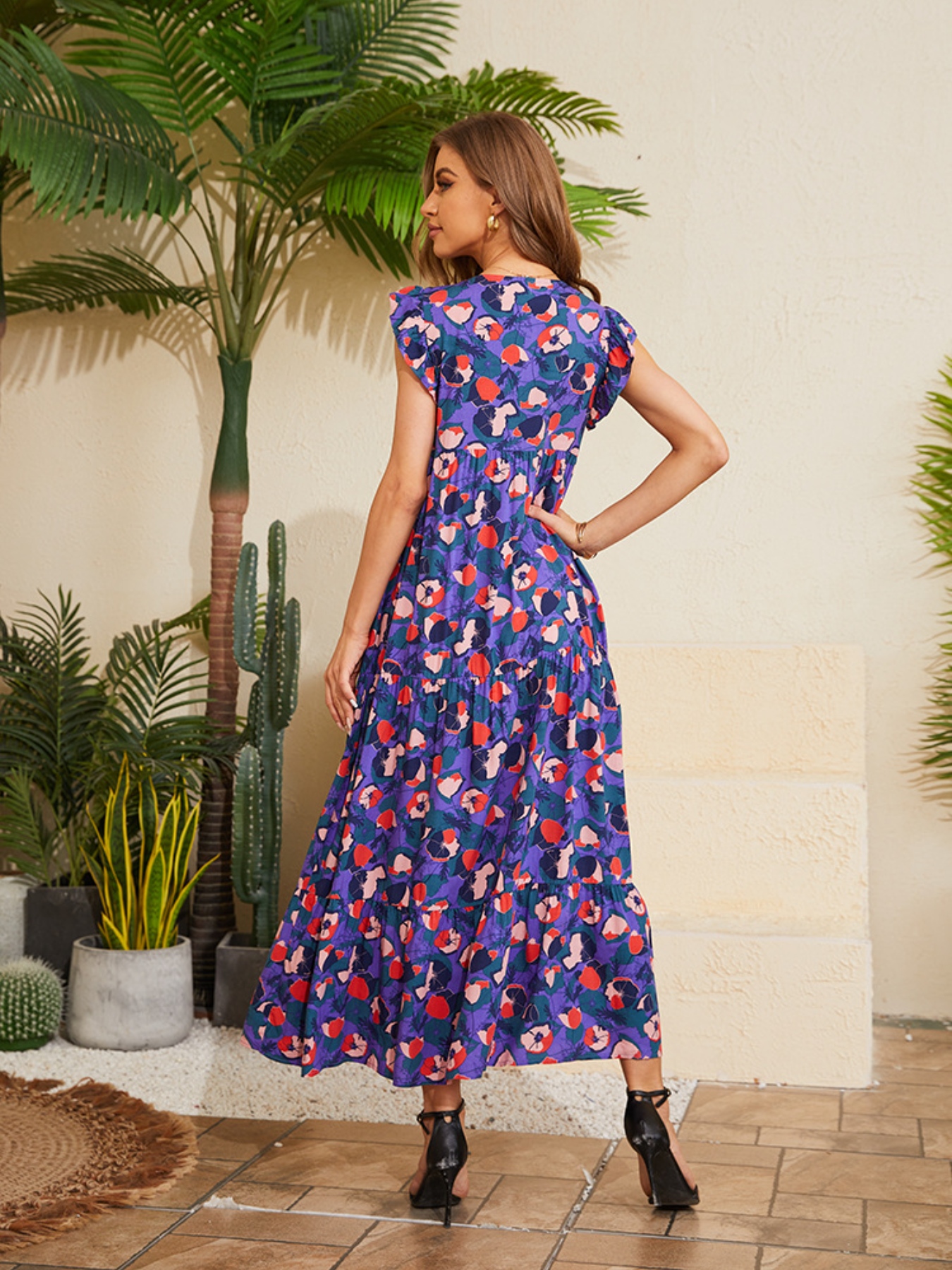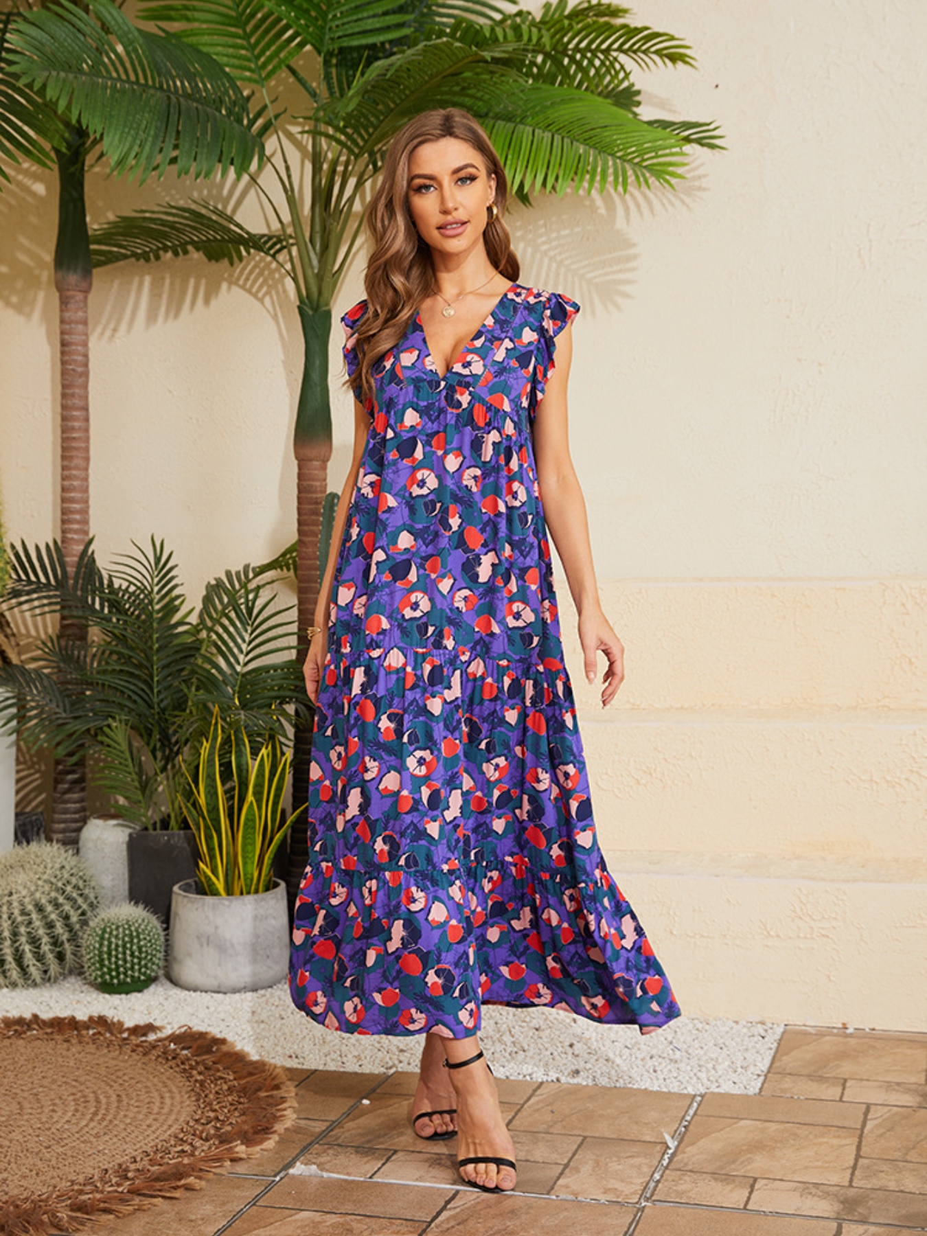 Floral V-Neck Cap Sleeve Summer Dress