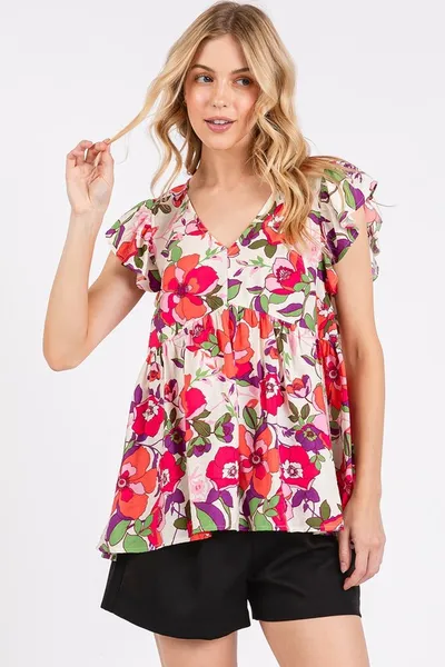 Floral V-Neck Ruffled Cap Sleeve Blouse