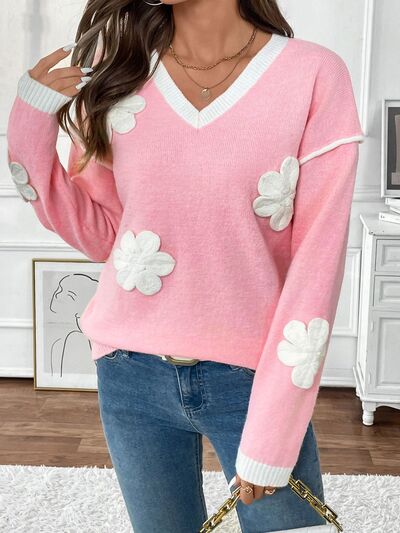 Flower V-Neck Long Sleeve Sweater