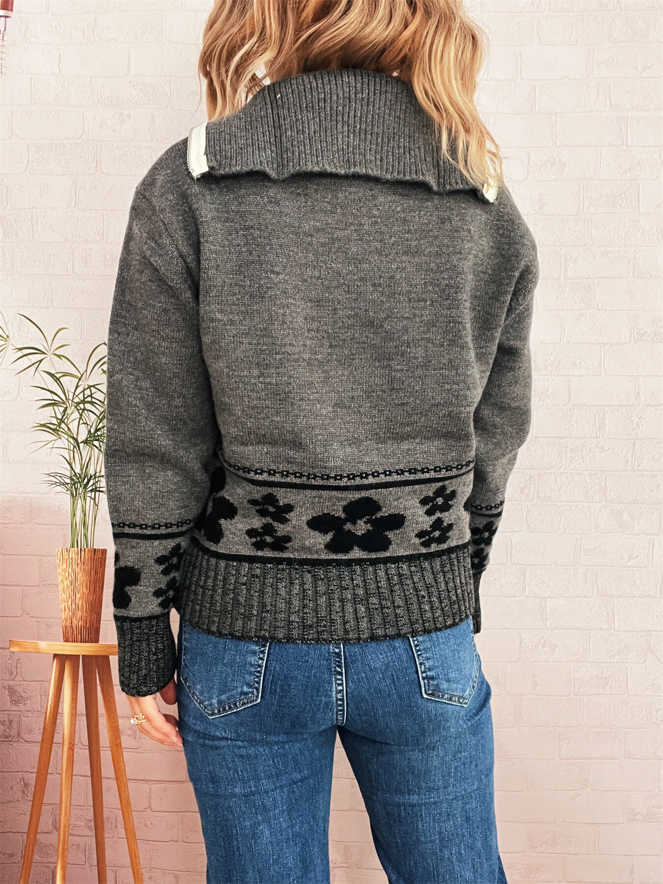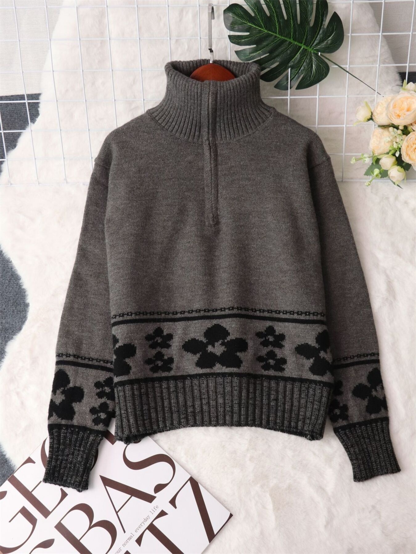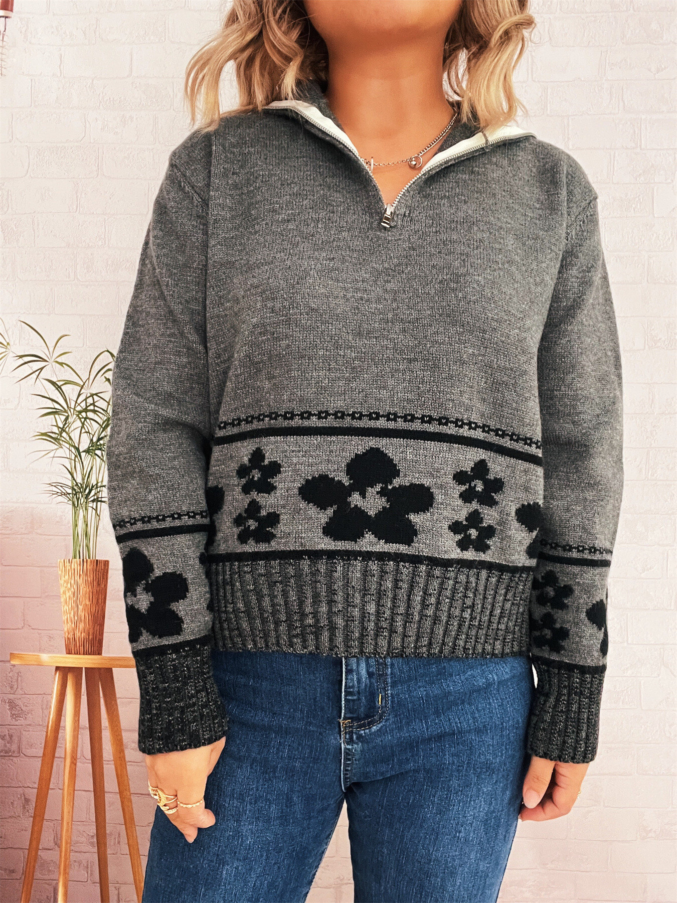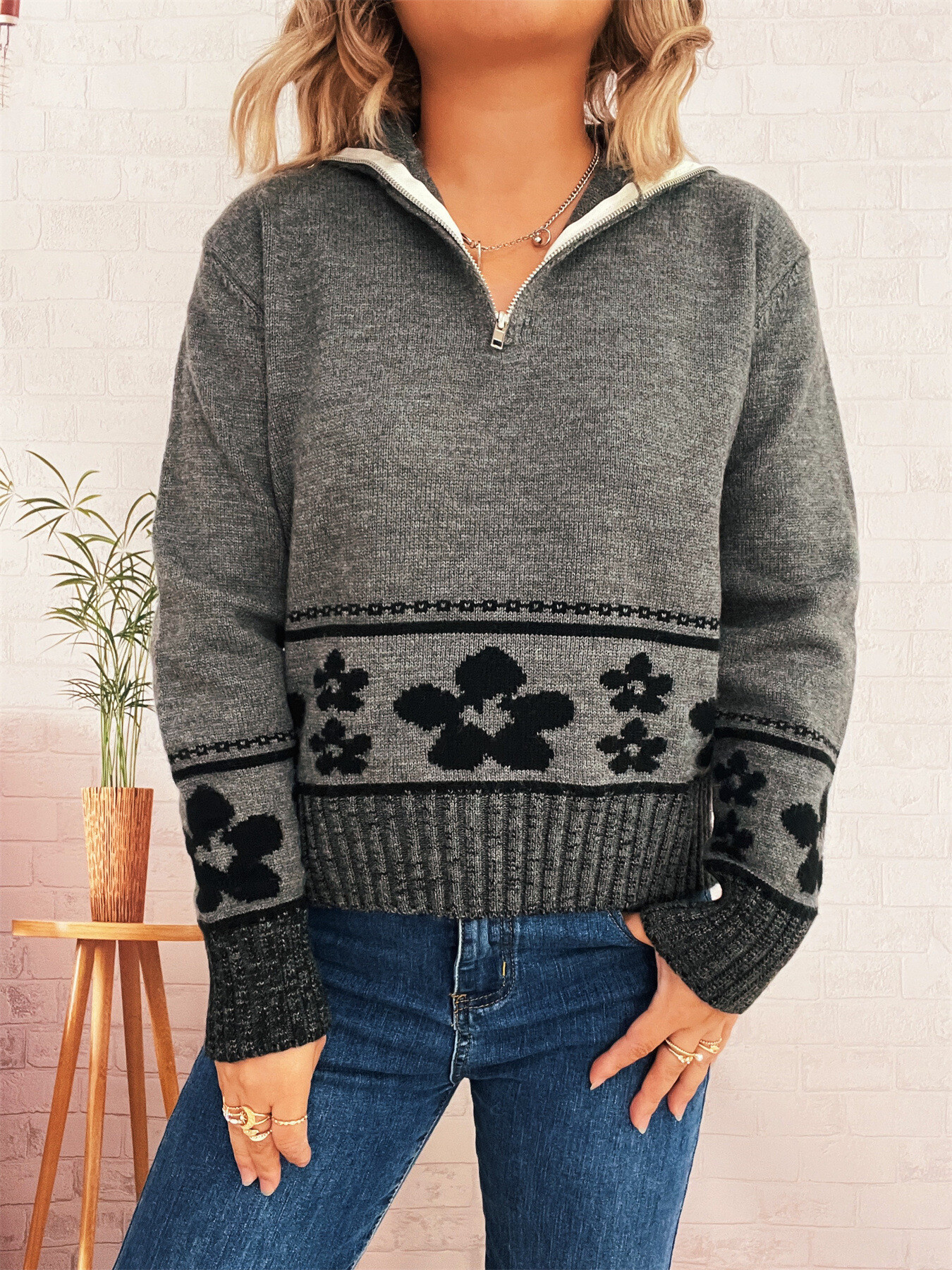 Flower Zip Collar Long Sleeve Sweater