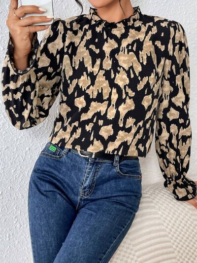 Frill Leopard Mock Neck Flounce Sleeve Blouse