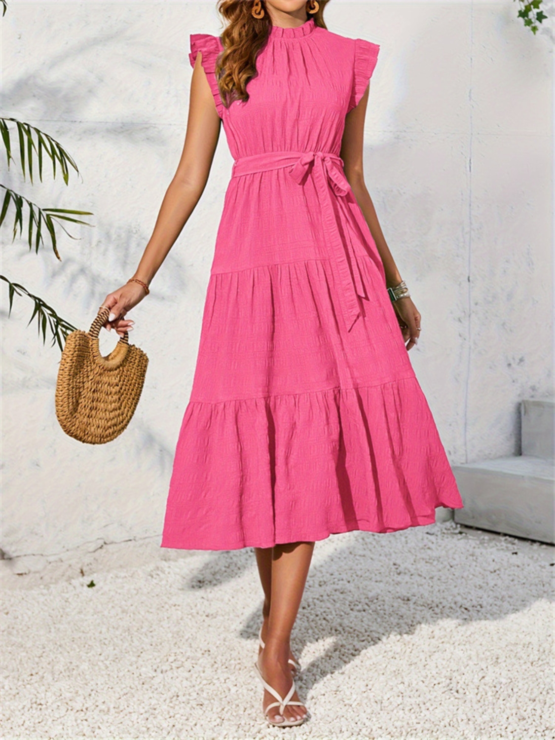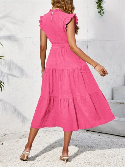 Frill Mock Neck Ruffled Cap Sleeve Midi Dress