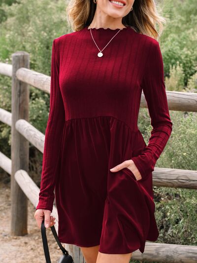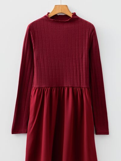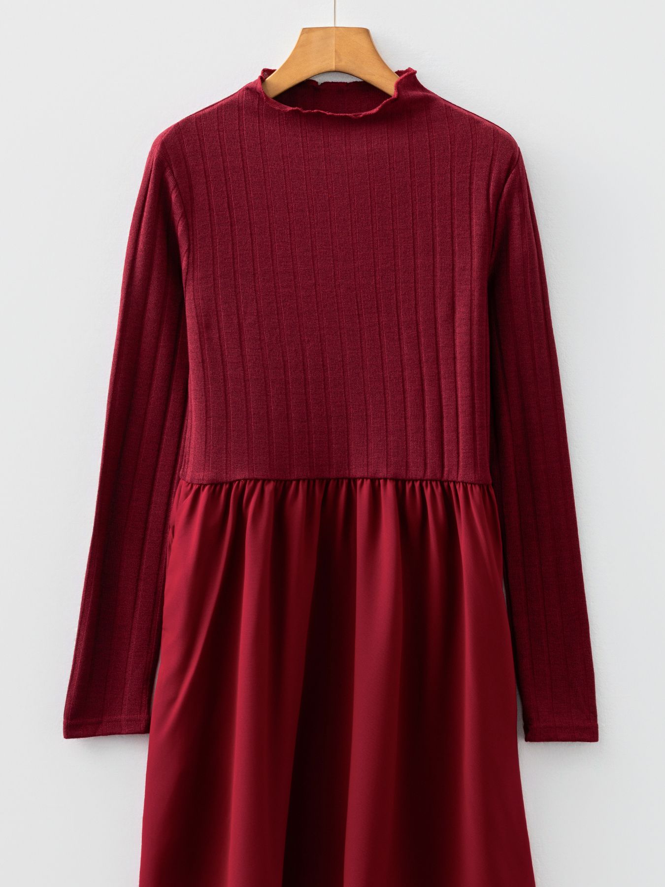 Frilled Neck Ribbed Knit Patchwork Long Sleeve Mini Dress