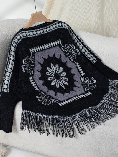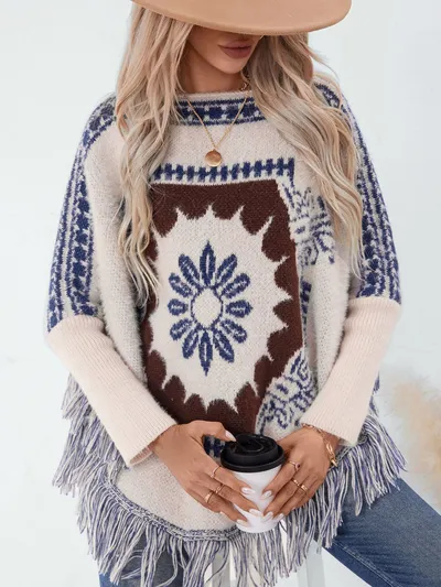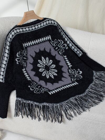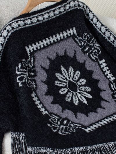 Fringe Geometric Long Sleeve Poncho