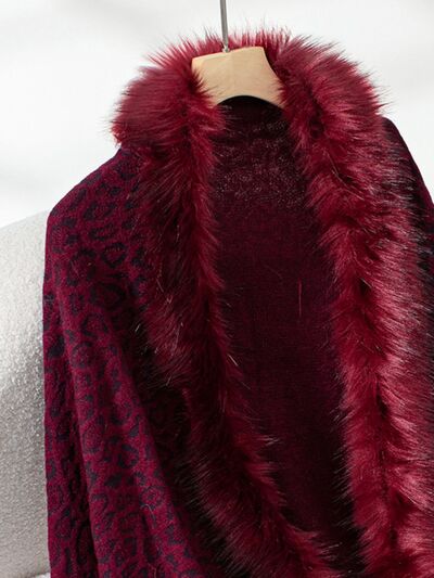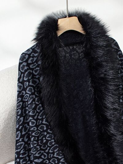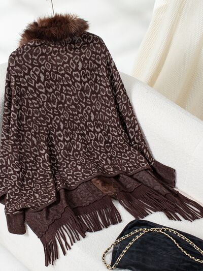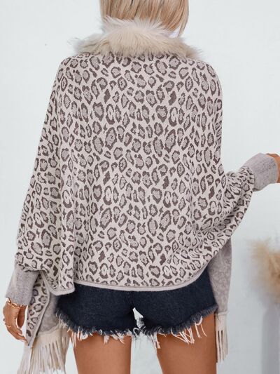 Fringe Leopard Open Front Long Sleeve Poncho