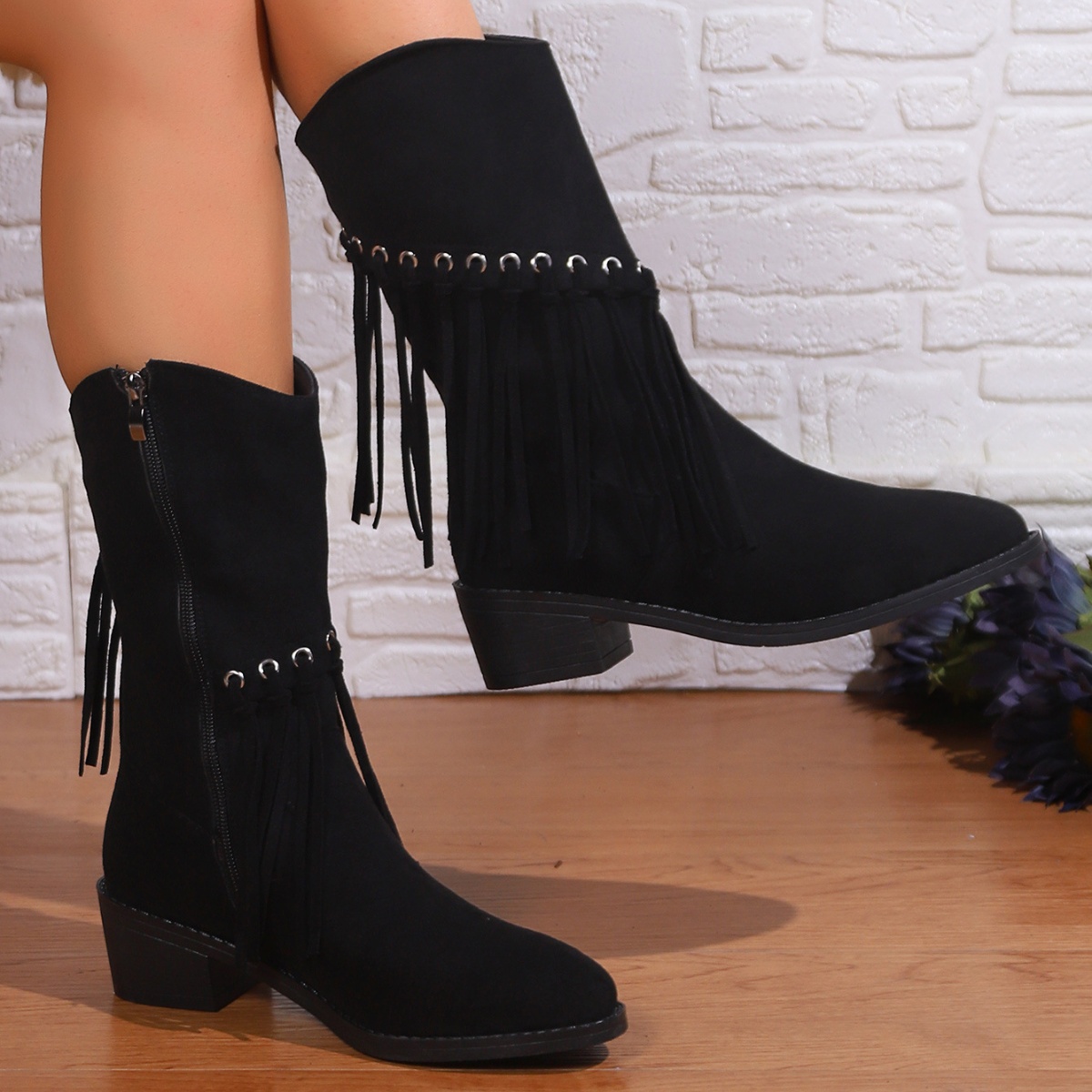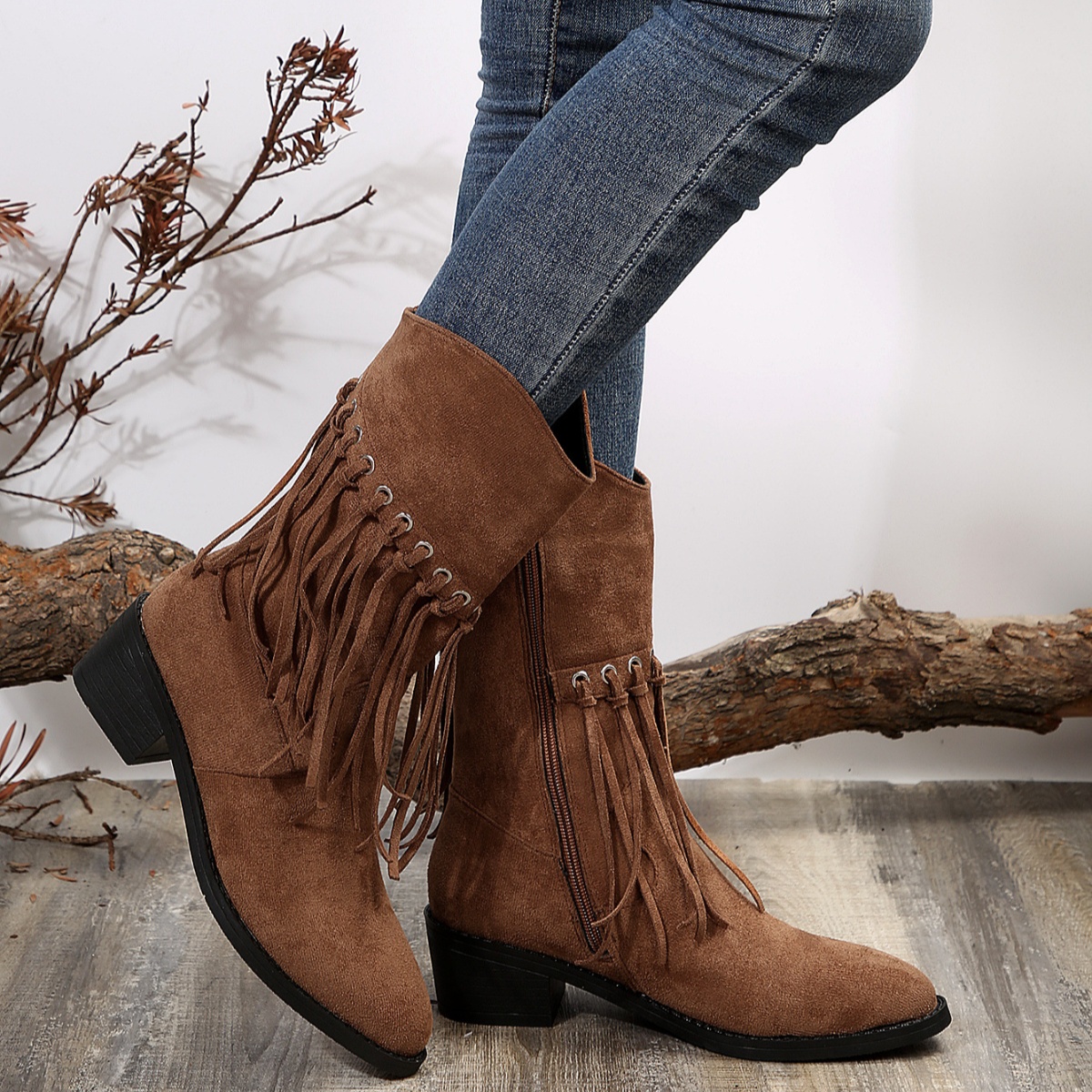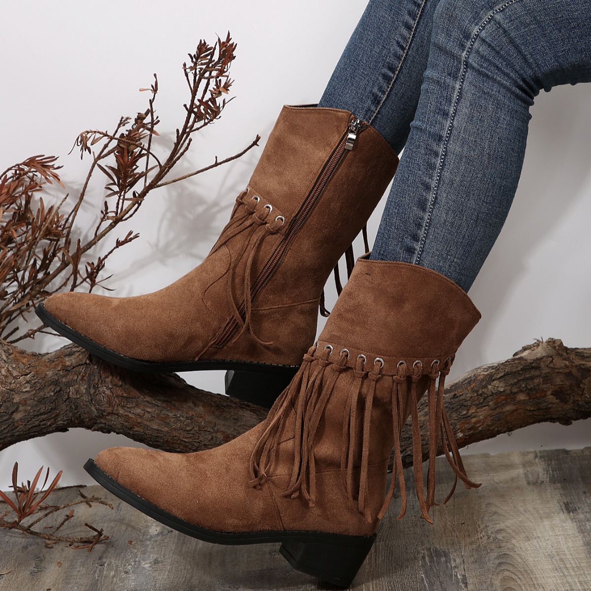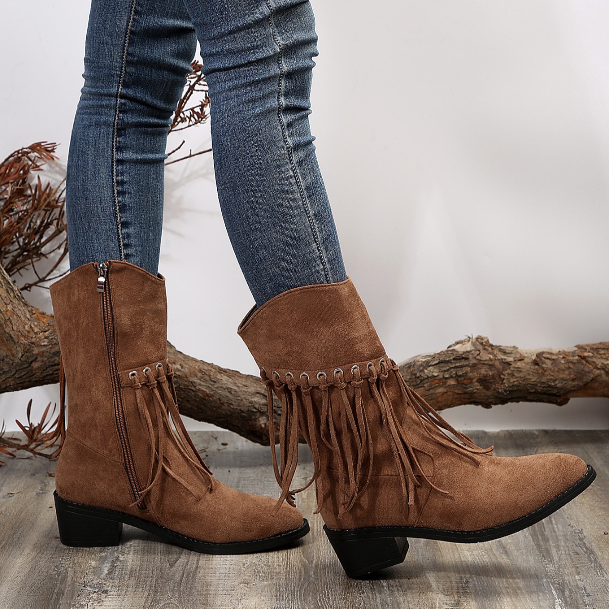 Fringe Western Block Heel Boots