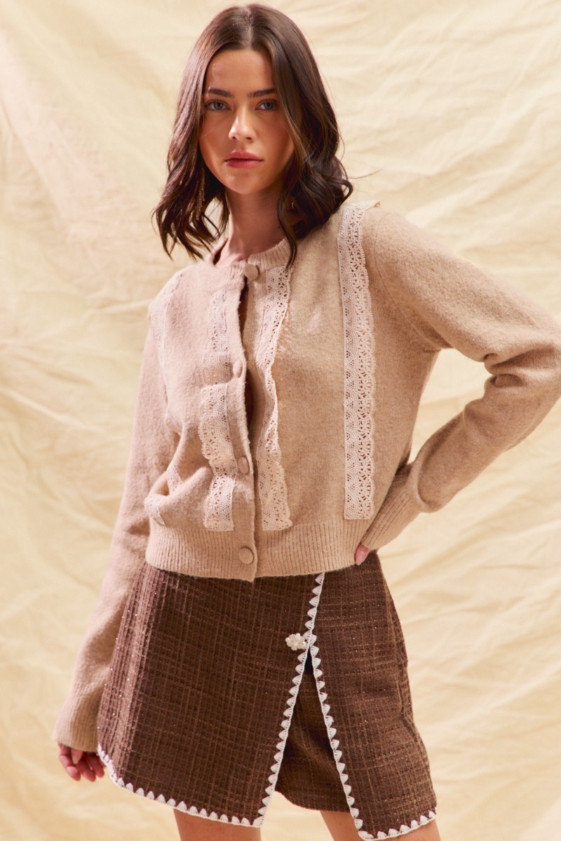 Front Lace Trim Button Cardigan Sweater