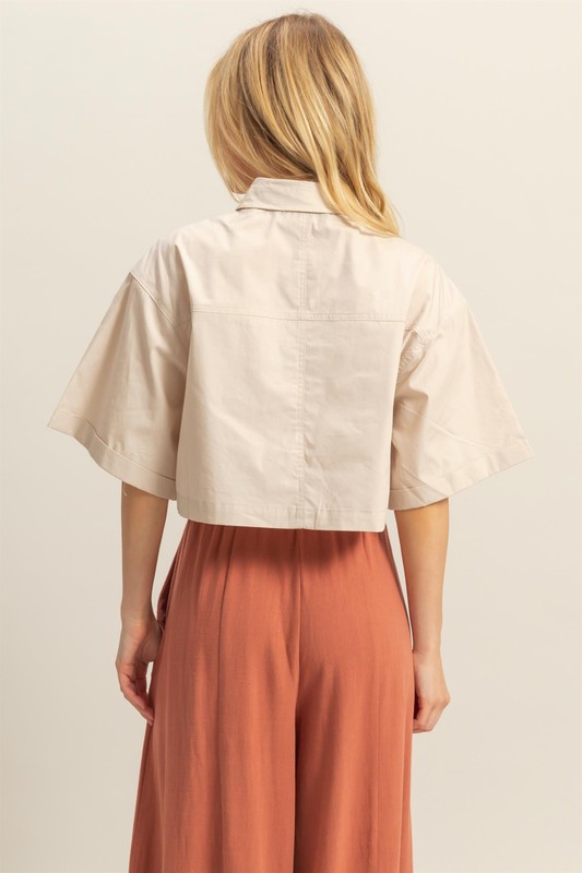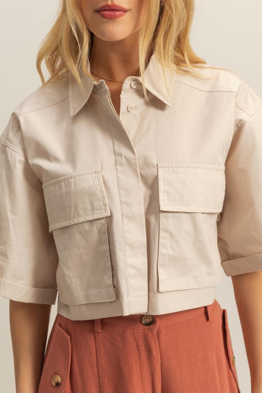 Front Pockets Poplin Collared Neck Crop Shirt