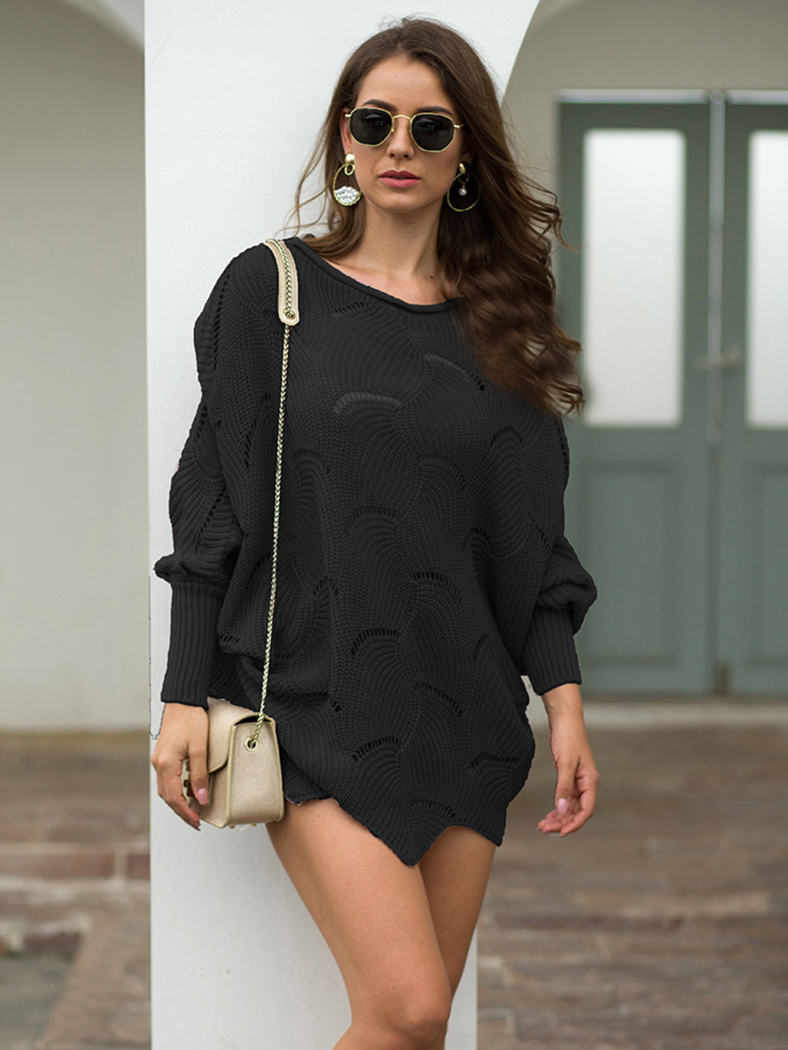Full Size Boat Neck Lantern Sleeve Openwork Knit Top