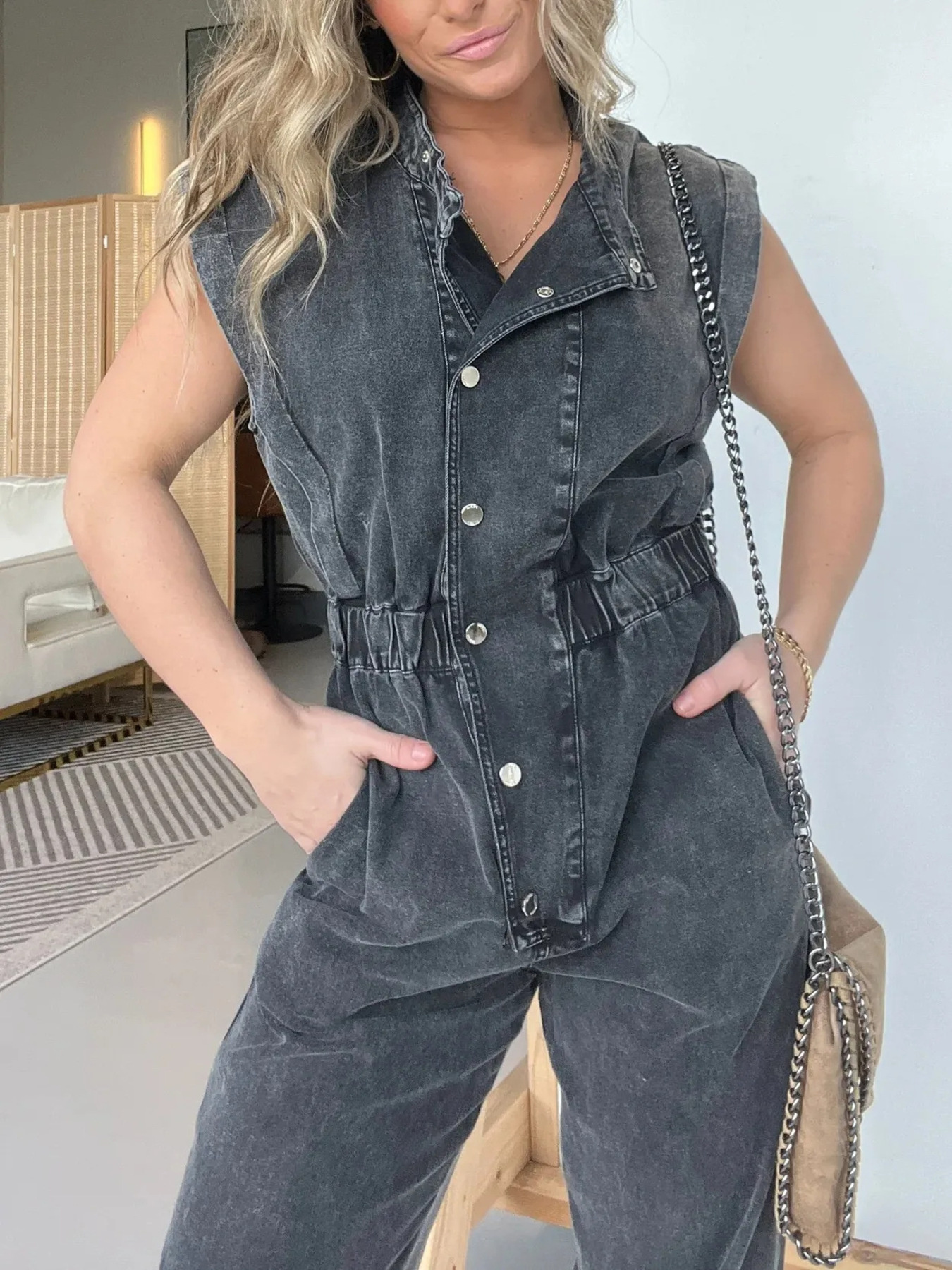 Full Size Button Front Cap Sleeve Denim Jumpsuit Plus Size